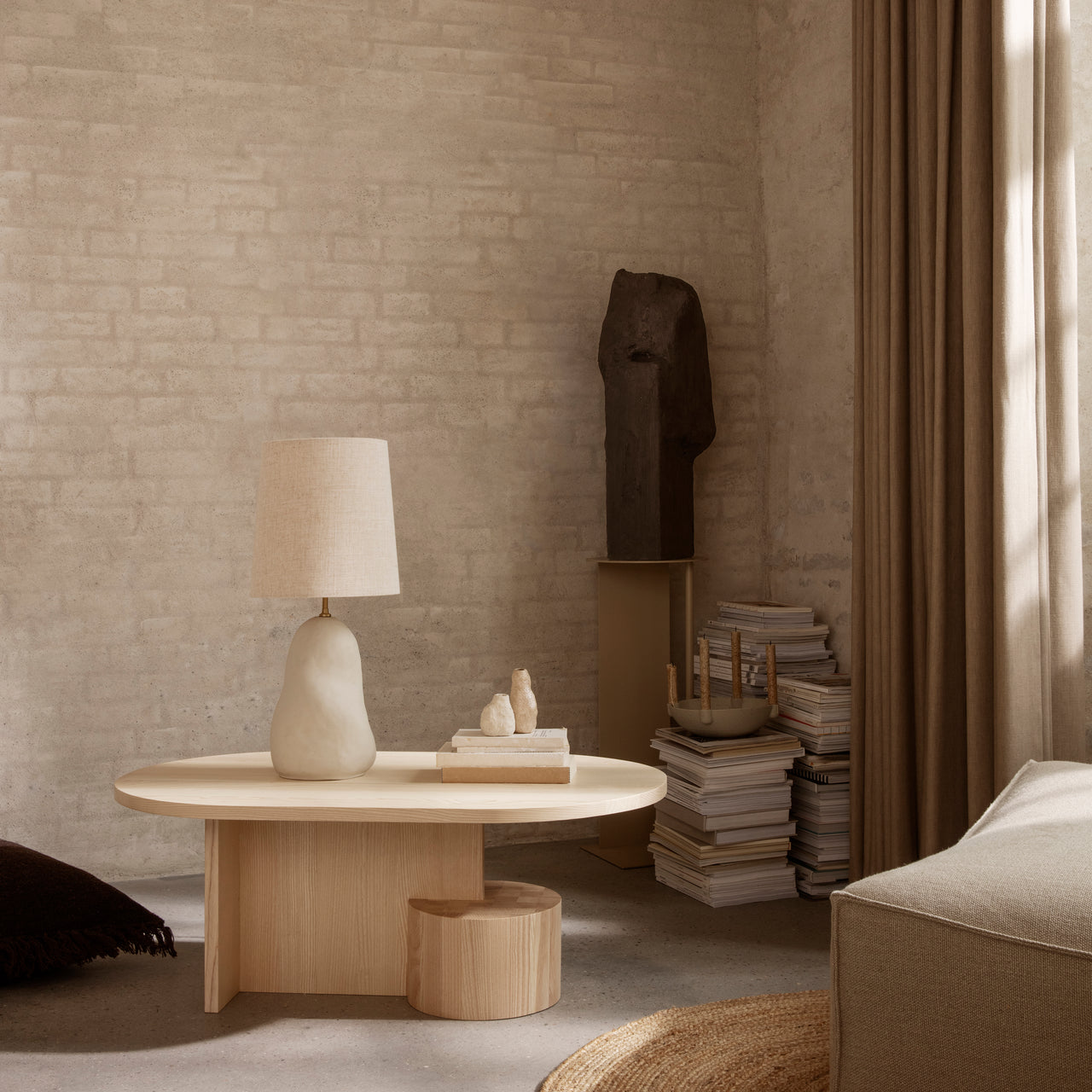 Copenhagen's Ferm Living plays with proportion with its sculptural coffee table crafted from solid ash and available in either a natural or black finish. The oval tabletop rests lightly on asymmetrically placed, right-angled panels anchored by a substantial cylindrical base. While functioning admirably as a coffee table, Insert also makes for an artful addition in the home.