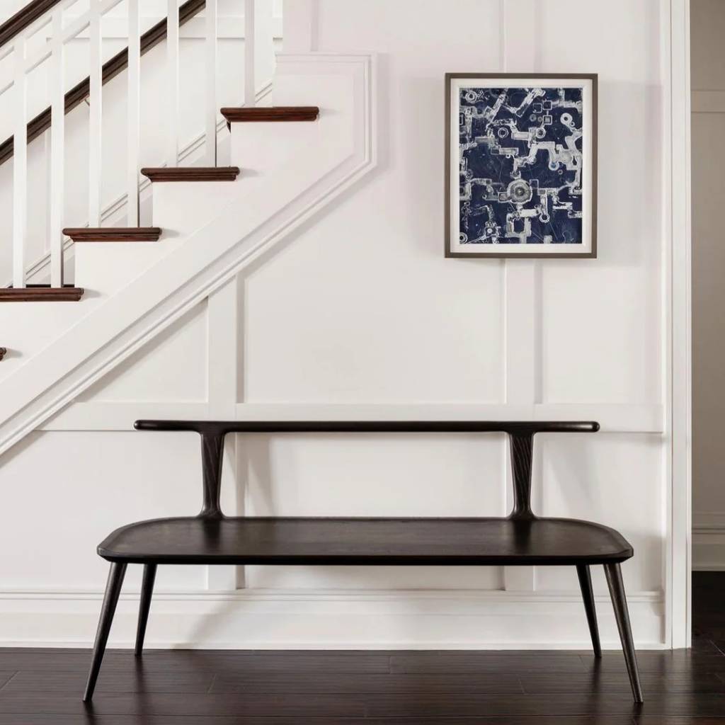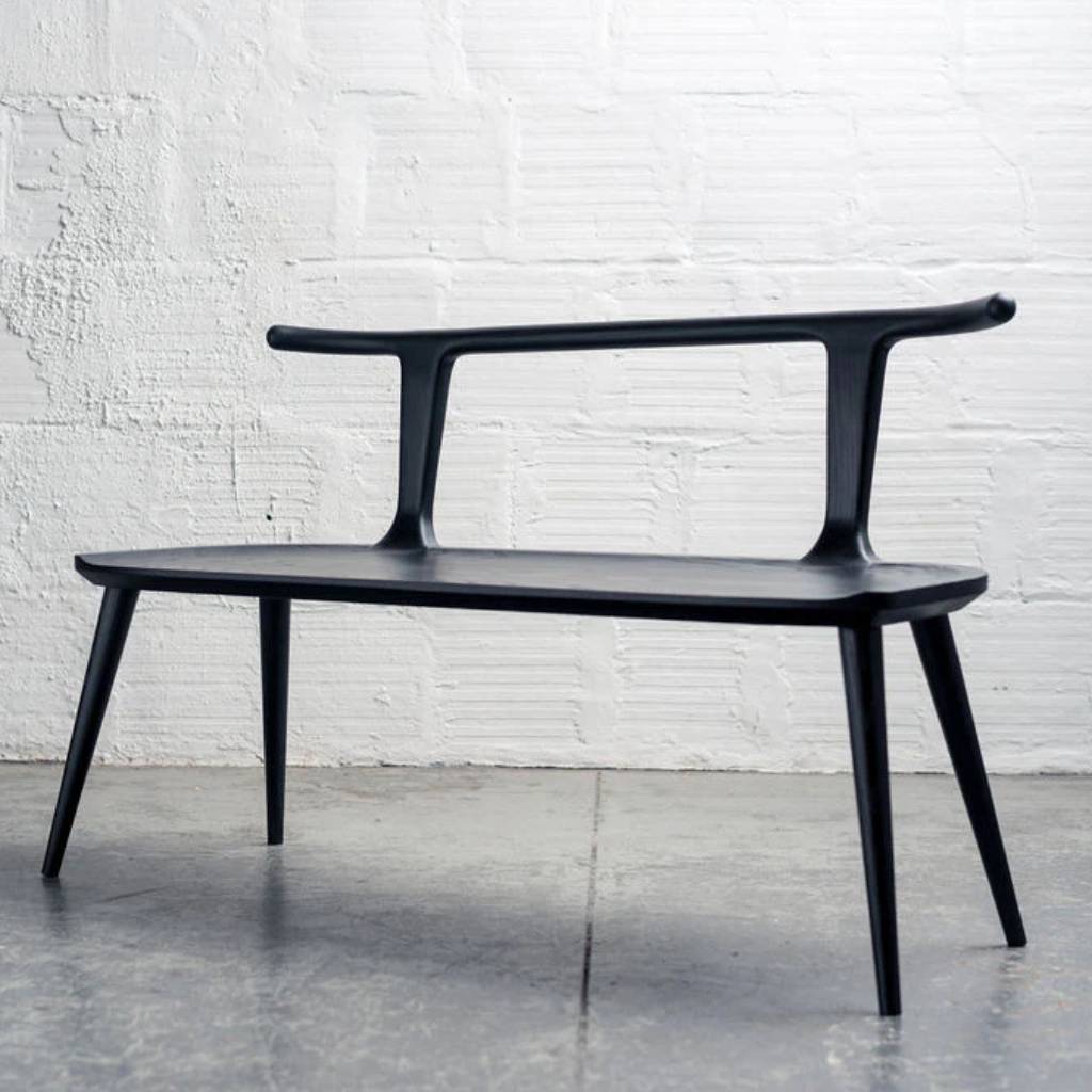 A masterfully designed piece that blends comfort and elegance with functional simplicity. Created by Justin Nelson, this bench features hand-shaped tubular curves, classic wedged-tenon leg joinery, and a beautiful finger-jointed back rail. It's available in three finishes: Walnut, White Ash, and Charcoal Ash, and can be customized in widths from 4 to 10 feet; the option of leather seat pads in various colors is also available.
