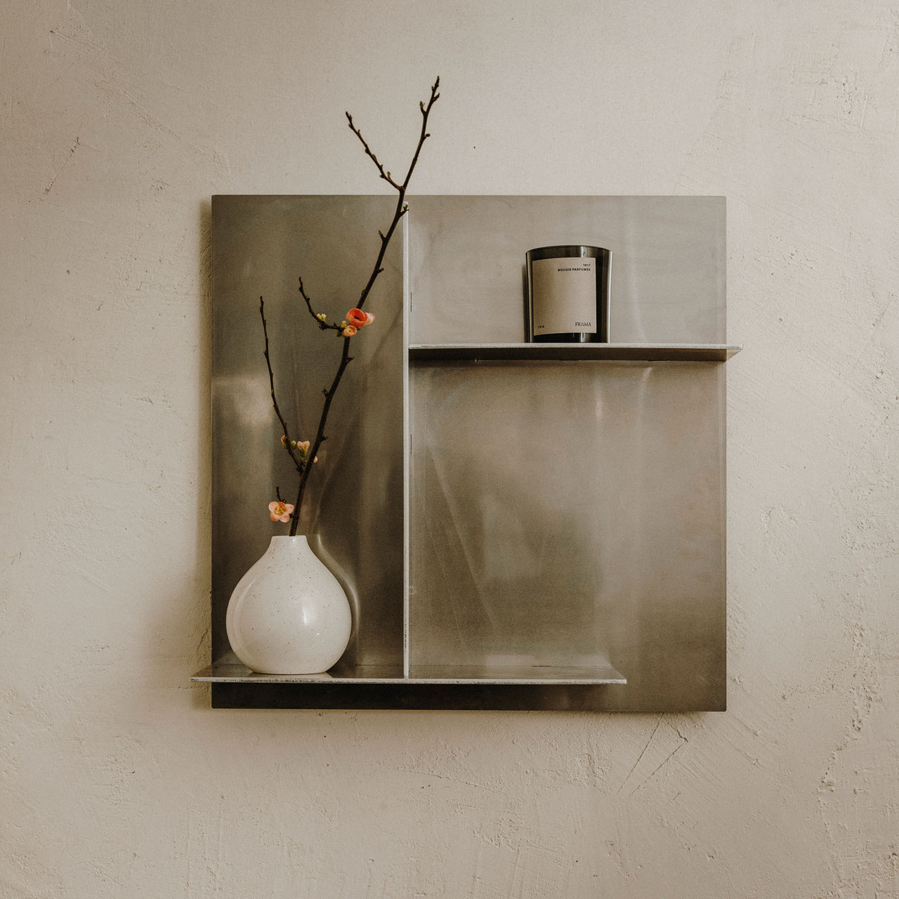 Suggested by old printer's works, Rivet Typecase is a compartmentalized metal shelf with discrete sections meant for storing and displaying cherished objects. Named for the process used in which laser-cut raw aluminum sheets are hammered together by hand, Jonas Trampedach's design is easy to mount on the wall with the accompanying backplate. And each piece is unique due to the unfinished look of the material with its individual natural irregularities.