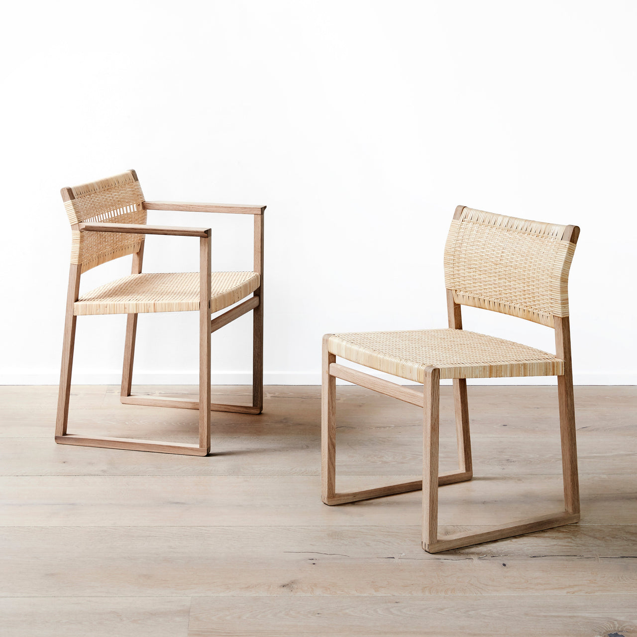 Derived from nature, a cane wicker seat adds a timeless appeal to Børge Mogensen's slim but robust 1958 dining chair in solid oiled or lacquered oak. Both the armless version BM61 and the armchair BM62 feature a seat that gently angles precisely where optimal support for the back is needed while the lower section supports the small of the back. Along with yielding outstanding comfort, the seating features finely crafted elements like exposed finger joints and runner legs that make it particularly suitable for use on carpets but it can also be fitted with included gliders on floors.
