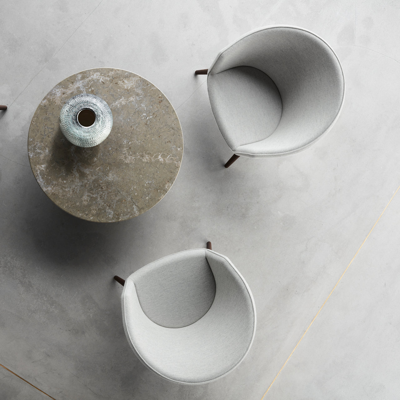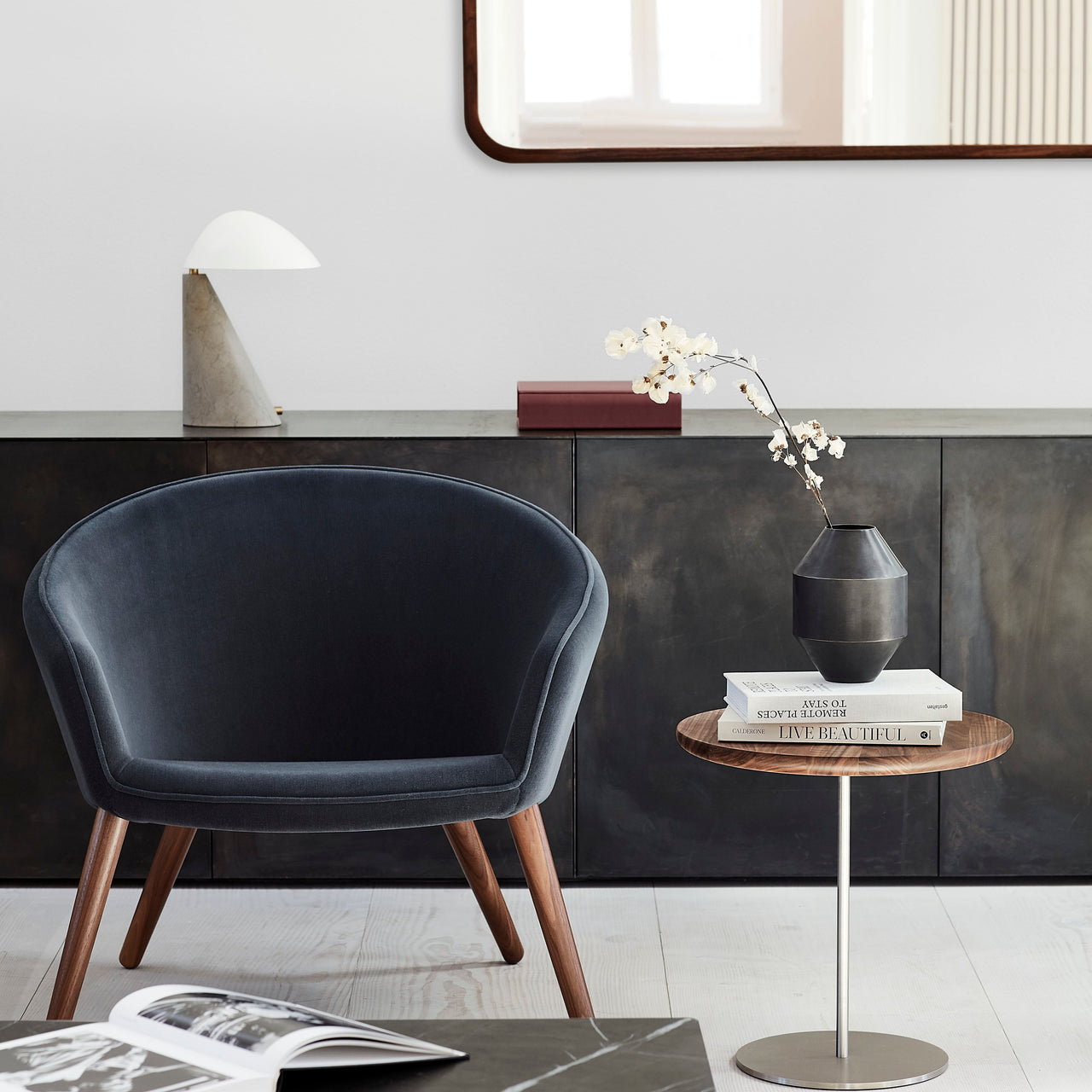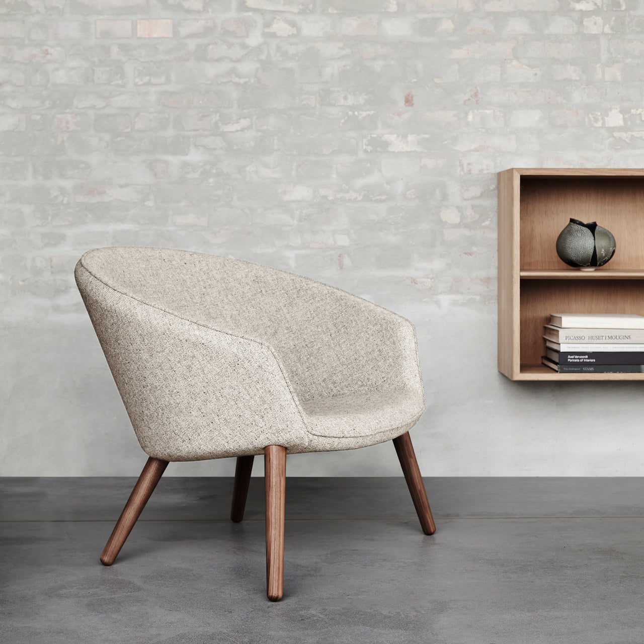 Designed by Nanna Ditzel and Jørgen Ditzel in 1953, this modern take on the traditional easy chair is amply proportioned for comfort with the slightly curved back extending to its armrests. A looker from any angle, the seating features a sculptural, organic silhouette balanced by splayed wooden legs as a playful touch. The high-pressured PUR-foam shell is enforced with a steel frame and upholstered in a choice of exclusive fabrics and the chair has achieved Greenguard Gold Certification.