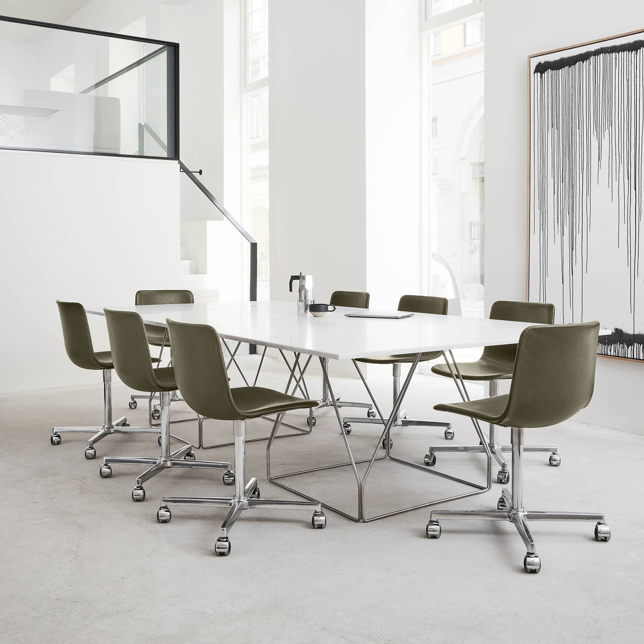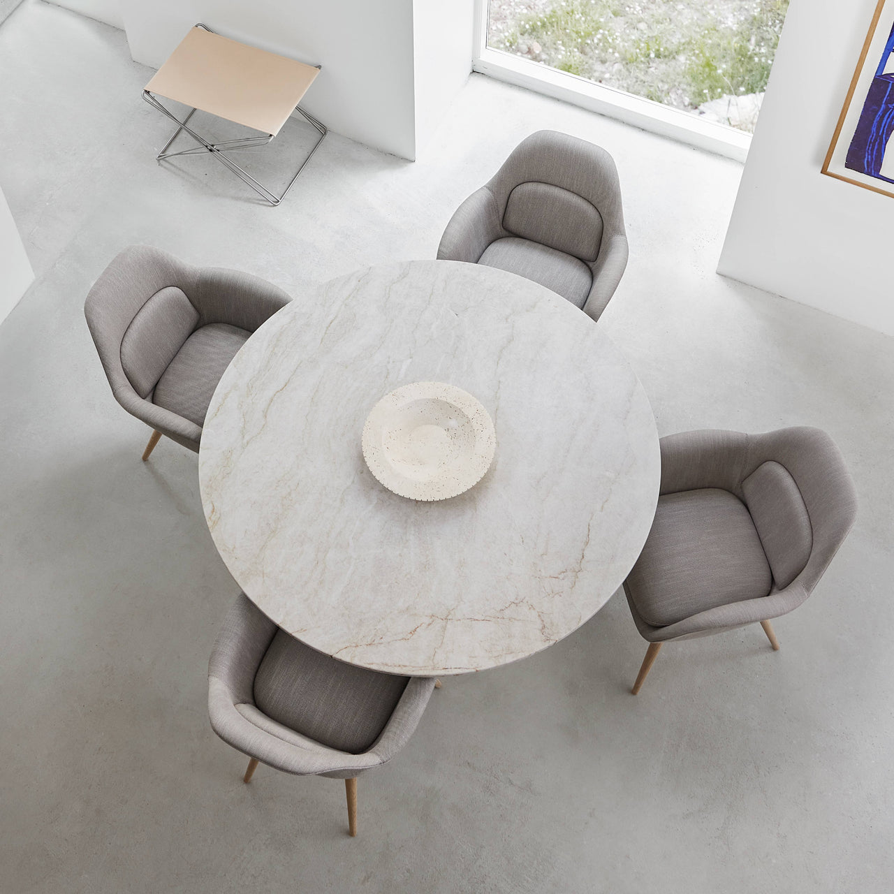 Jørgen Gammelgaard’s enduring 1984 design reflects his desire to create a simple, elegant piece with a supportive structure that would not limit the seating around the table. Providing remarkable stability as well as an intriguing graphic aesthetic, JG Table features a base in stainless steel or powder-coated finish with the choice of a round or square tabletop in varieties of solid stone or in a durable matte linoleum.