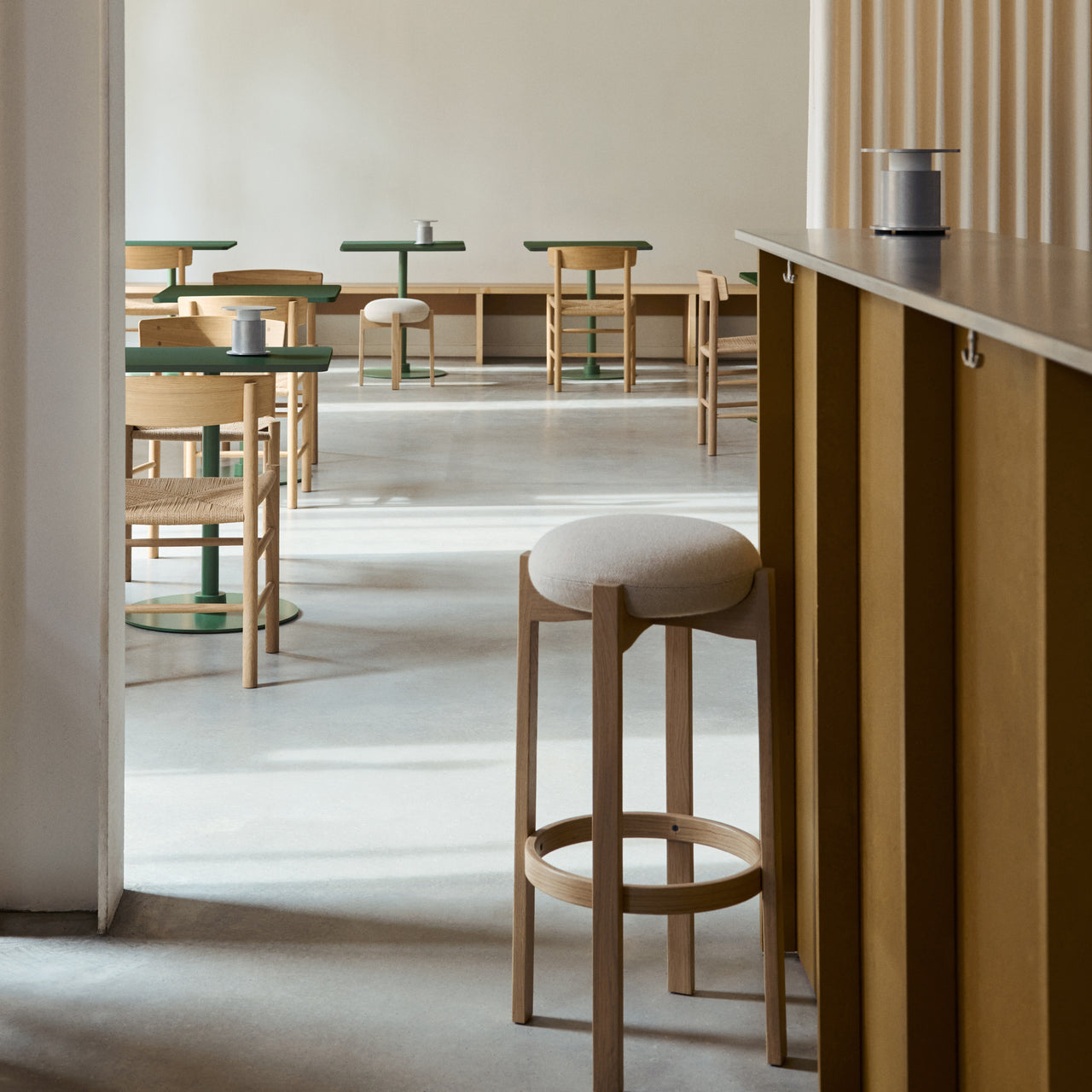 The Pioneer Bar + Counter Stool combines a soft, round seat with a sensual wooden frame. Designed by Maria Bruun, a Danish designer known for her sculptural minimalism, the stool's four vertical legs unite in a cross composition with elegant indentations, supporting the upholstered seat cushion. Available in various finishes and upholstery options.