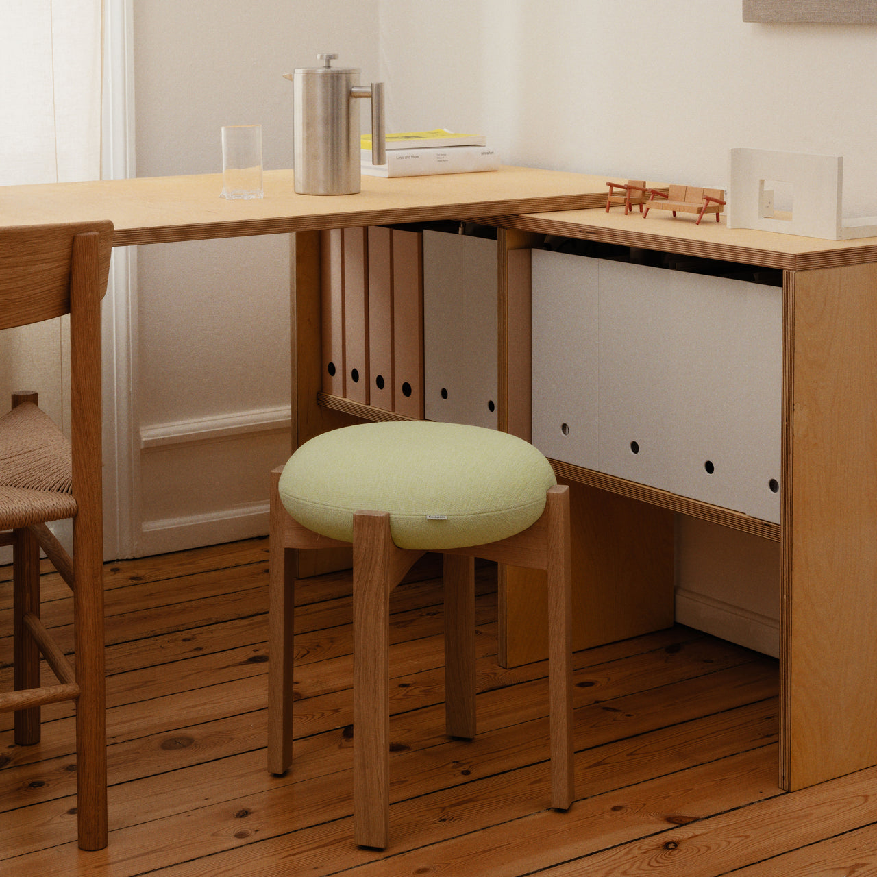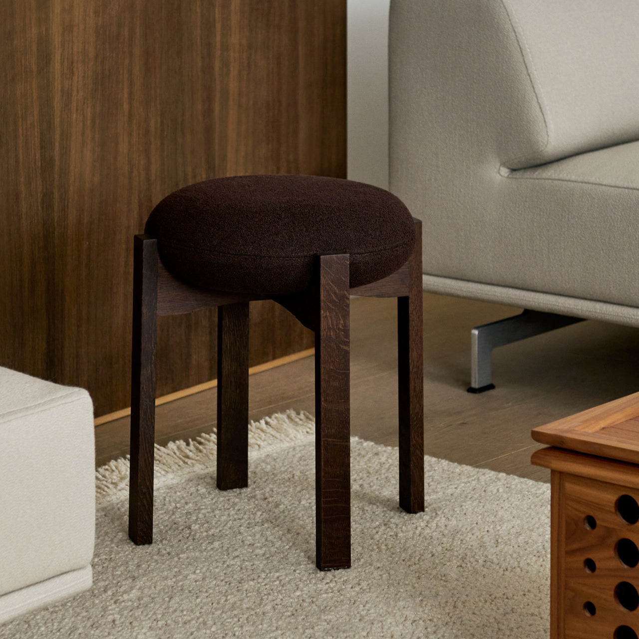 The Pioneer Stool combines a soft, round seat with a sensual wooden frame. Designed by Maria Bruun, a Danish designer known for her sculptural minimalism, the stool's four vertical legs unite in a cross composition with elegant indentations, supporting the upholstered seat cushion. Available in various finishes and upholstery options.