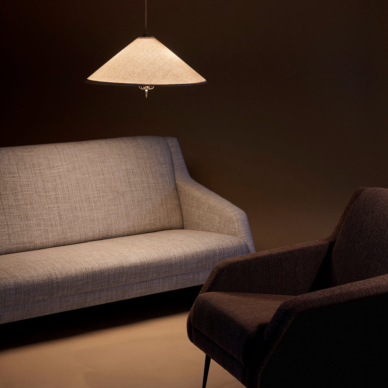Indirect, warm light filters through a conical canvas shade, diffusing gently to create an inviting glow both below and around the fixture. A fabric diffuser beneath the bulb further softens illumination, while a polished brass counterweight pulley offers effortless height adjustment and a sculptural touch. Originally conceived in the 1950s by Paavo Tynell—known as “the man who illuminated Finland”—this pendant blends technical ingenuity with artisanal poise to deliver timeless atmospheric lighting.