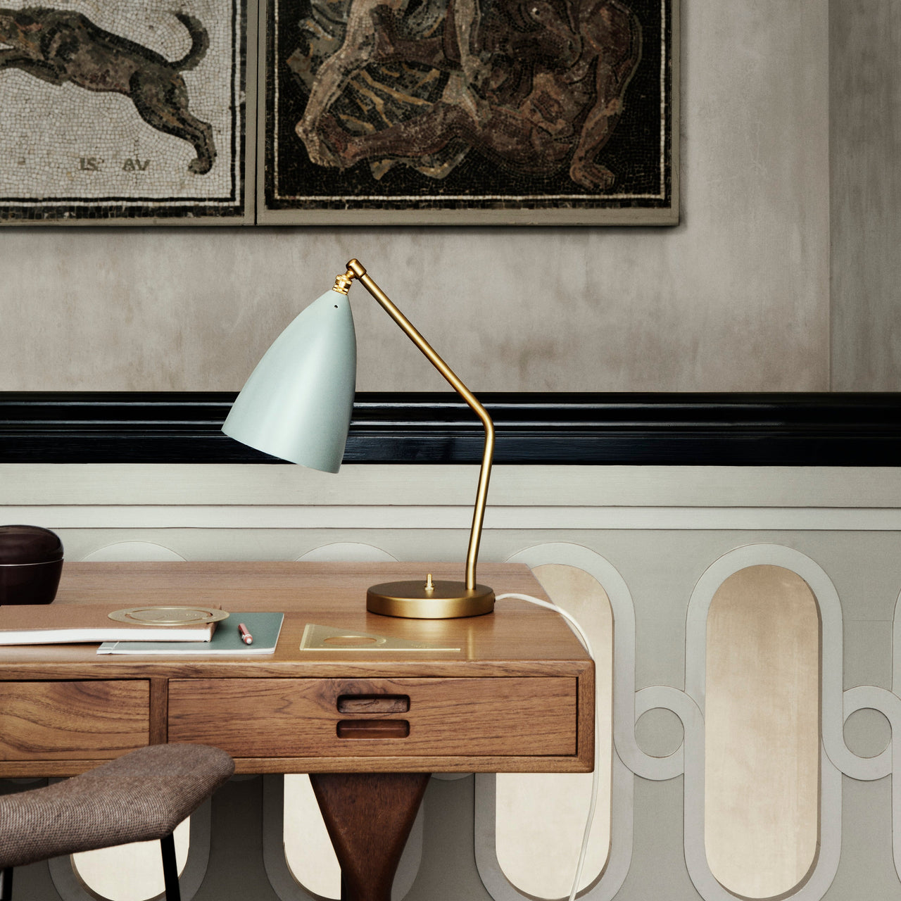 Wittily playing on nature, Gräshoppa Table Lamp reveals iconic midcentury designer Greta M. Grossman's sophisticated yet whimsical view. Introduced in 1947, the elongated conical shade is beautifully combined with a tubular brass stand, a now-classic pairing. Both organic and modern, Gräshoppa makes a notably functional addition to a desk or as a sophisticated light source in any room.