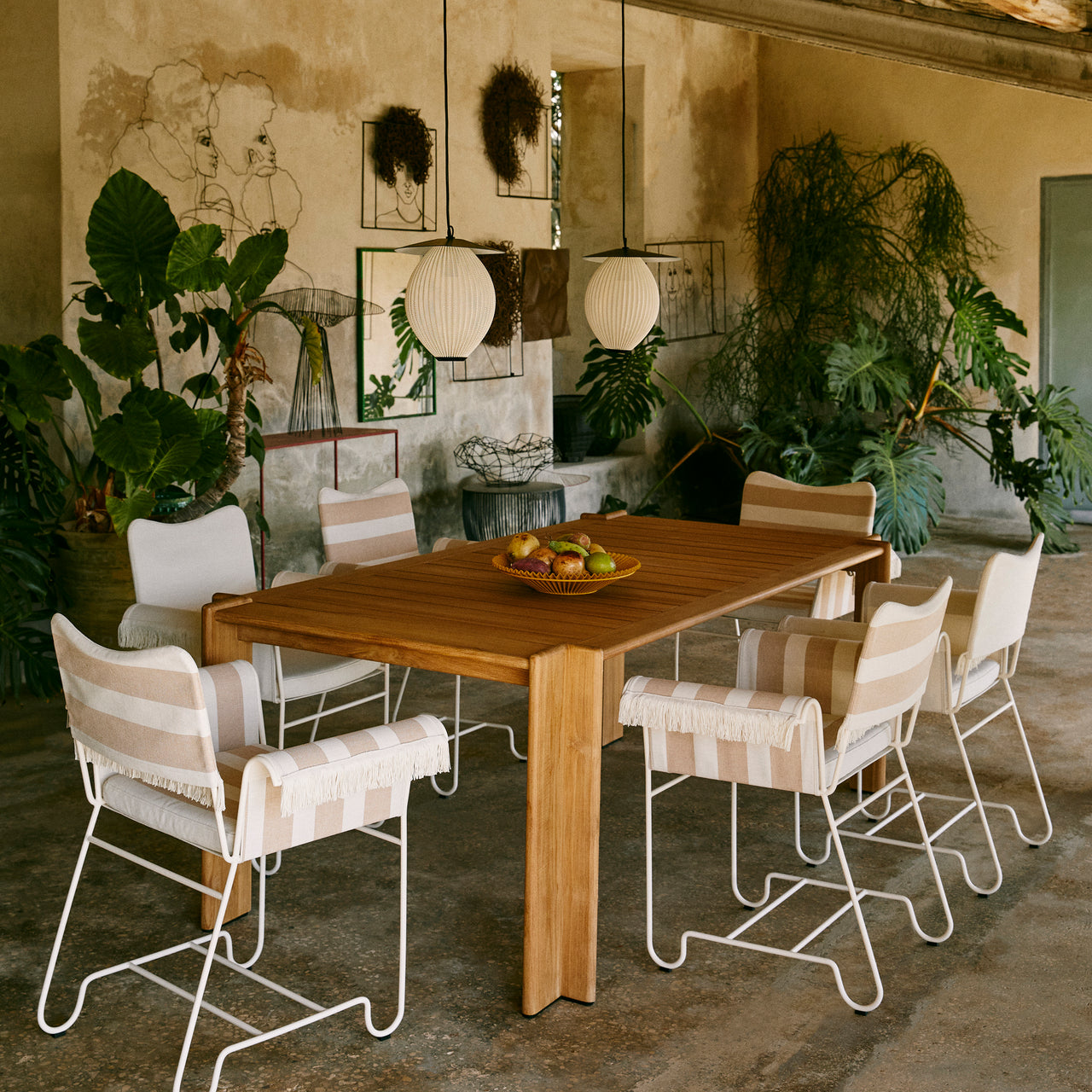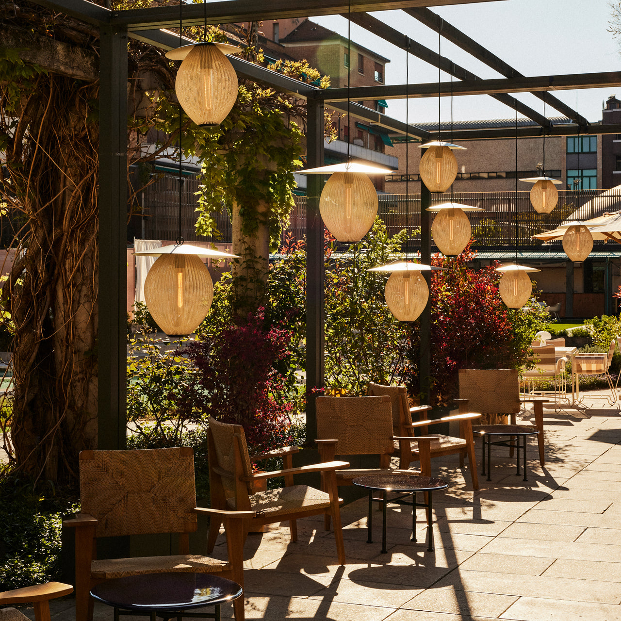 Gubi’s reimagined Satellite Outdoor Pendant adapts Mathieu Matégot’s whimsical 1953 original specifically for alfresco use, down to the ovoid shade crafted from a perforated sheet of stainless steel topped with an aluminum cap that helps direct the light. Ideal for installation on covered patios, verandas or other sheltered dining areas, the pendant comes in a choice of 2 sizes with the semi-matte shade in either cream or mustardy gold.
