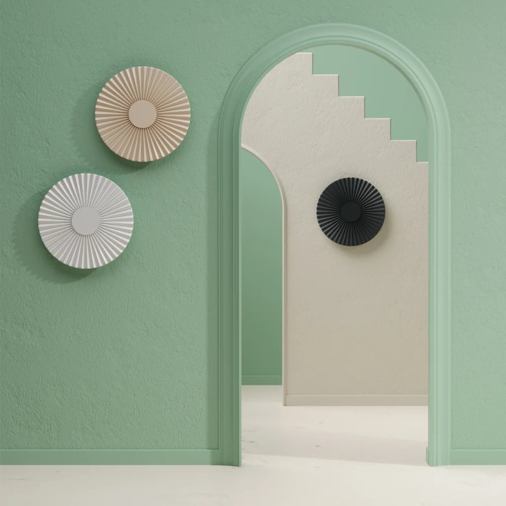 Carmen’s wall-mounted version restages the original’s bewitching pleated “tutu” to brighten a bedroom, living room or hallway with its warm LED glow. Made in France and designed by the PaulinePlusLuis duo for Hartô, the lamp’s laminated, pleated shade fans out from a matching matte-lacquered metal disc and comes in a balletic nude pink, white or slate grey.