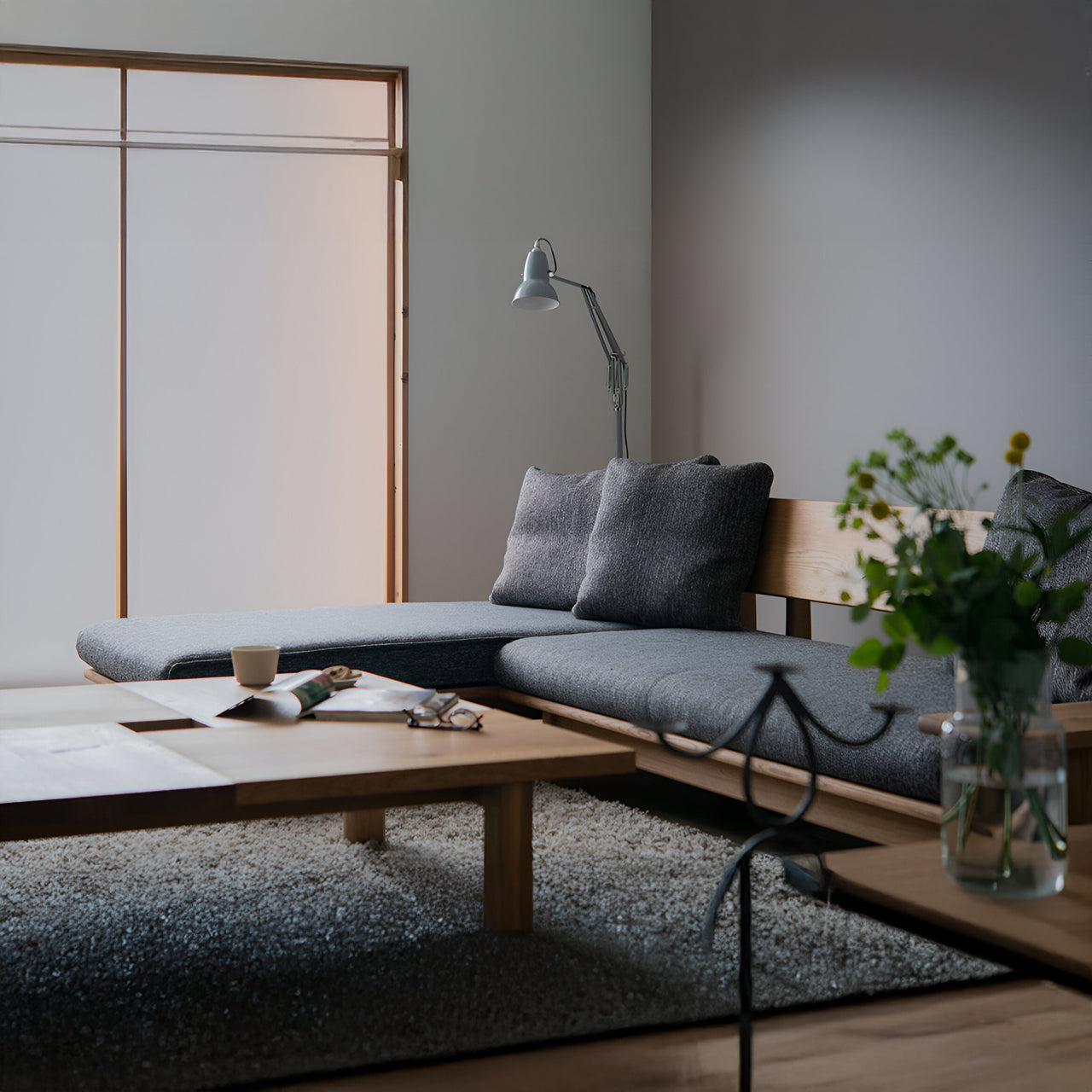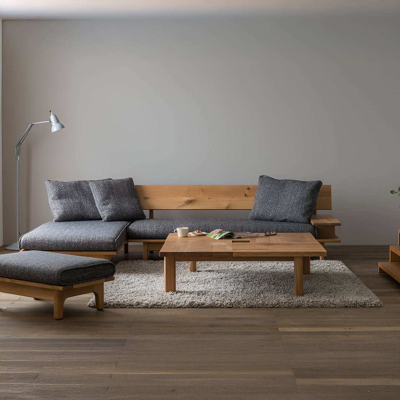 The Words from Forest 3-Seater Sofa features a low-slung profile with broad wooden arms that highlight the natural character of the timber. Crafted from solid oak, the sofa is finished with a durable polyurethane resin coating, enhancing the wood’s rich grain and texture. Designed by Toshimitsu Sasaki, known for his skillful integration of natural materials with meticulous construction.