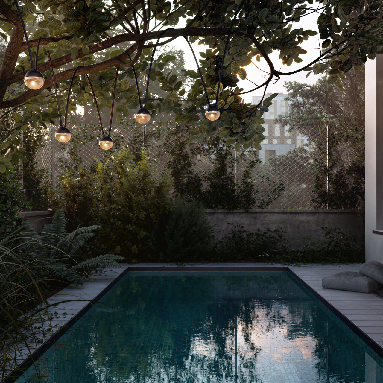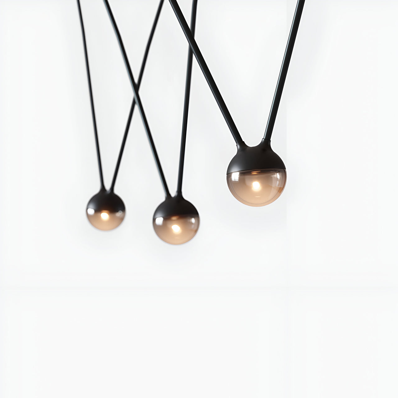 The Cherry Bubbls Canes is a lighting accessory that enhances tables for any occasion. It features a powder-coated steel holder that attaches to table tops and includes a discreet power bank and driver beneath the table. The light chain has seven spherical luminaires made of black silicone and smoke-colored glass, emitting warm white light. Powered by a rechargeable battery, it offers flexible placement and up to 40 hours of use, depending on brightness. The setup is ideal for tables 2 to 4.5 meters wide and comes in a sleek black finish.