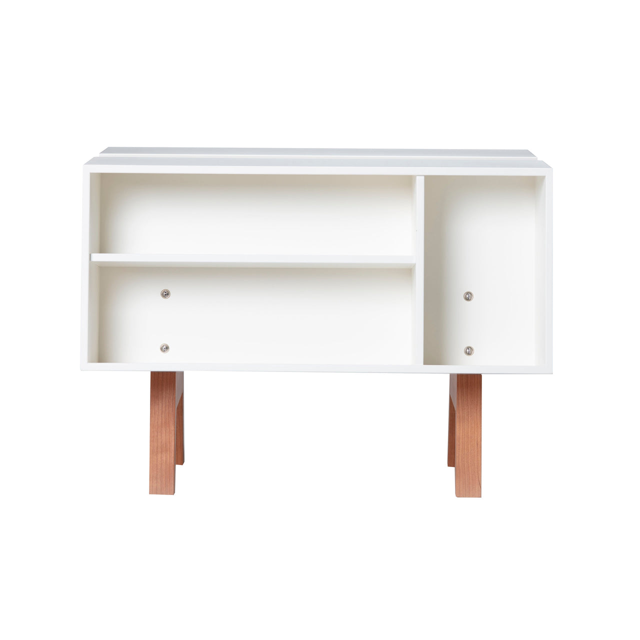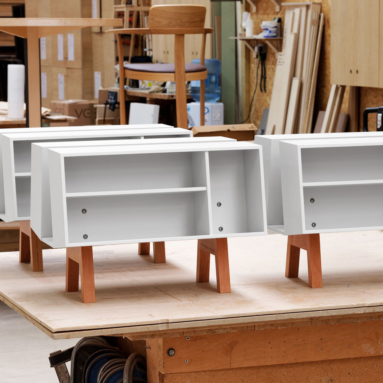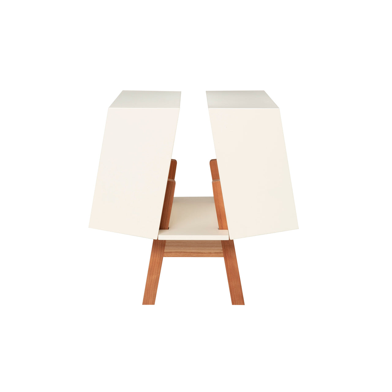 When Isokon commissioned designer Ernest Race to refashion the original 1939 Donkey in 1963, the result was advertised as an “obliging creature which holds up to 90 paperbacks…and provides a convenient chairside table.” Still handcrafted in London today, the clever double-bookcase structure features warm cherry wood legs and a white lacquered body.