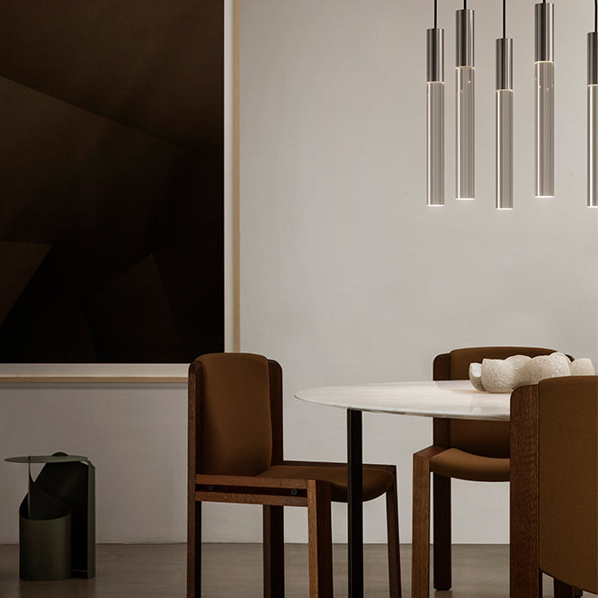The Plexi pendant lamp distributes light through its cylindrical shape. It provides a soft glow along its length and focused illumination from its sandblasted lower end. This design enhances the lighting effect on the surfaces below. Initially produced in limited quantities, it has been reintroduced in 2 sizes and finishes to suit different spaces. The designer emphasized the honest use of materials in crafting this piece.