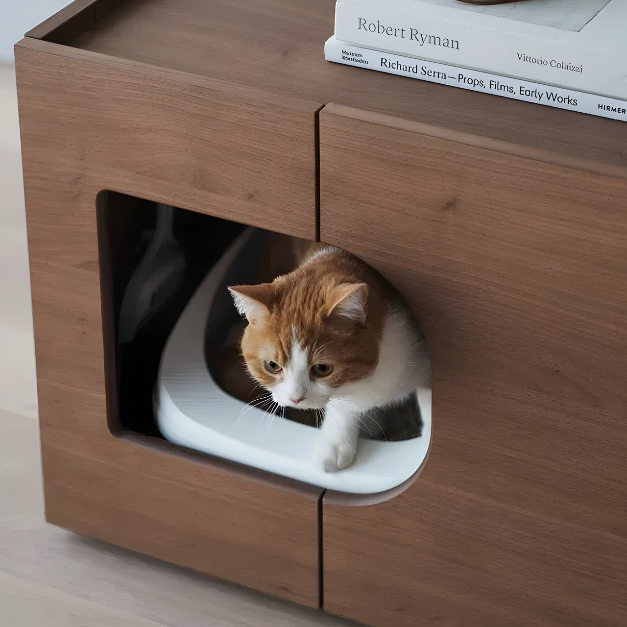 Crafted with precision in Japan, the Karimoku Cat Box offers an elegant solution for discreetly housing a cat's litter area. Made from premium oak or walnut wood, it ensures long-lasting durability and stability. The spacious interior comfortably accommodates one cat, while a separate compartment provides convenient storage for cleaning tools.