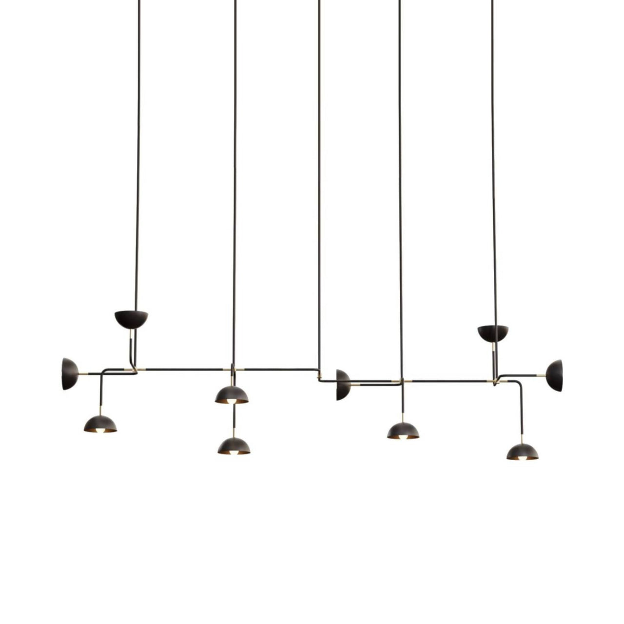 Spectacularly scaled and aglow with 10 milk glass orbs radiating warm LED light, Beaubien 10 is a commanding presence. The largest of this series of Lambert & Fils' shaded suspension lamps, it features the characteristic twisting and turning black structure with warm brass connectors and metal domes in a choice of the brass or graphite. A wondrous coup ?de ?theatre, it’s completely handmade at the brand's Montreal atelier.