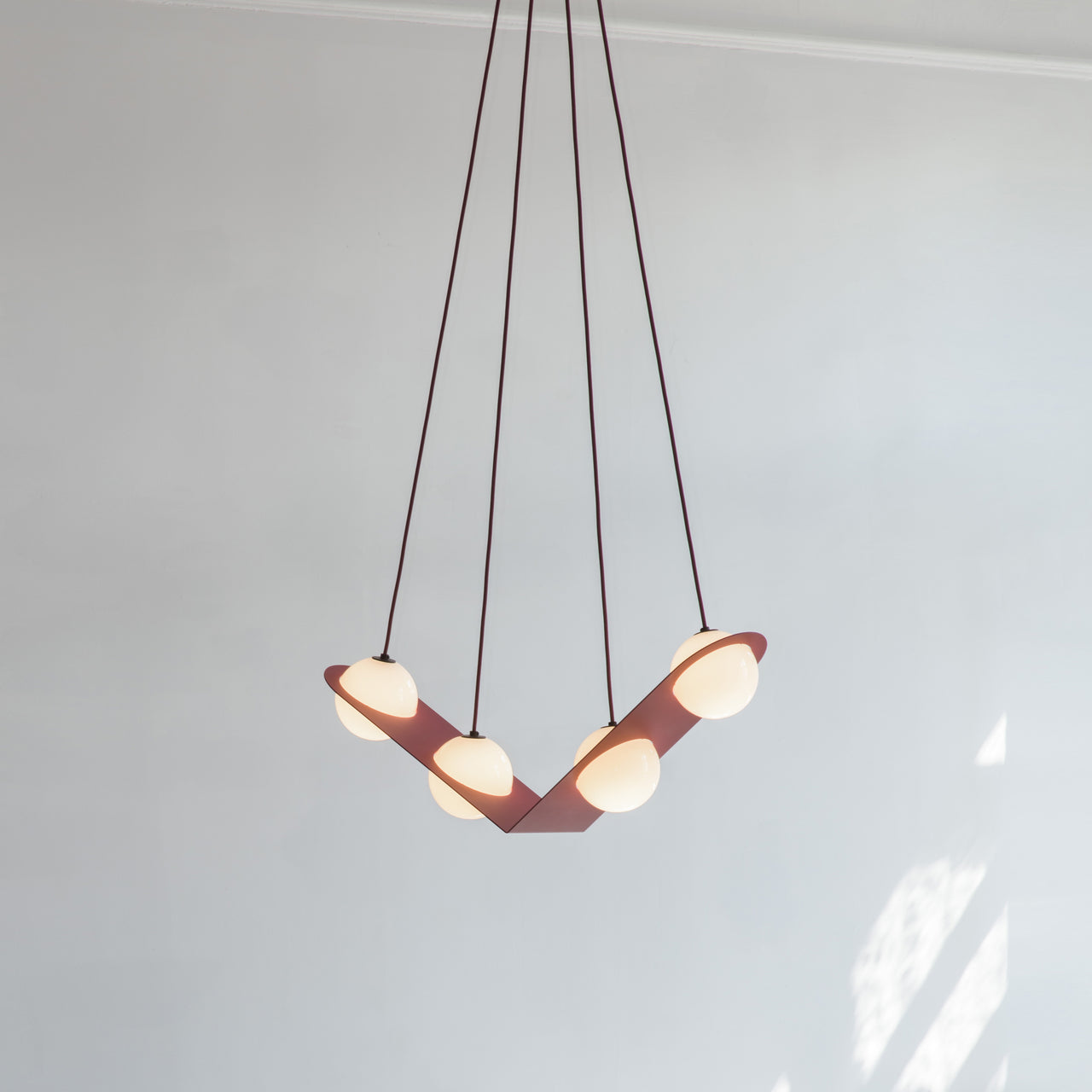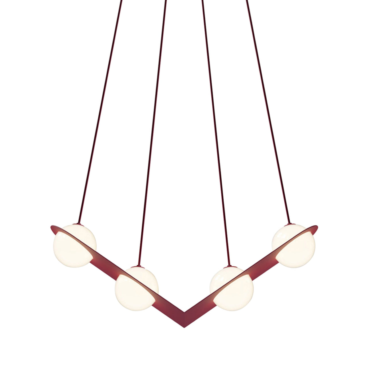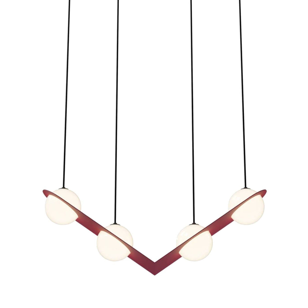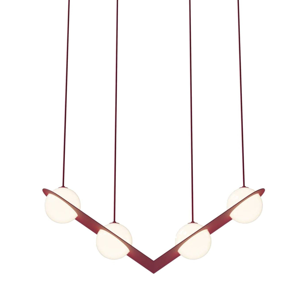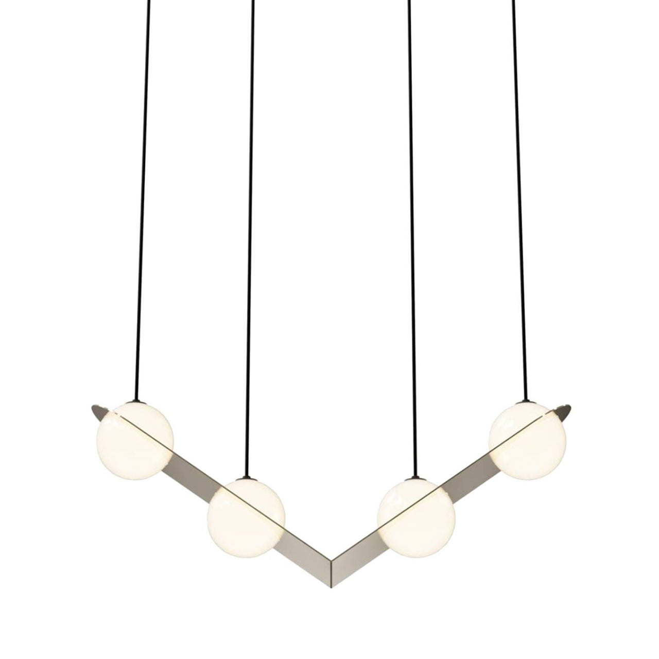 Laurent 02 follows Lambert & Fils collection's geometric template with its 4 handblown opaline globes "sliced" by a classic V-shaped metal structure. Offering an ambient LED glow via the milky glass forms, the suspension light is available in an curated choice of finishes in polished brass, nickel-plate or varied colors of powder-coated aluminum. With a choice of angled- or parallel-mount models, the striking fixture is handmade at the brand's Montreal atelier.