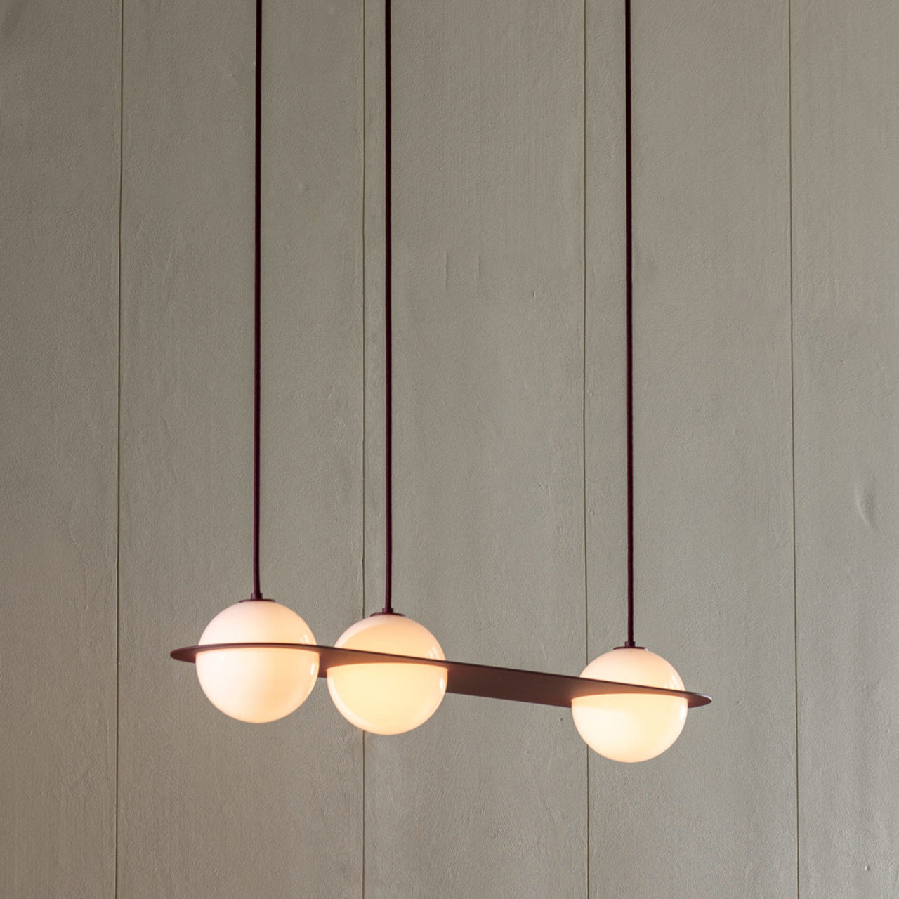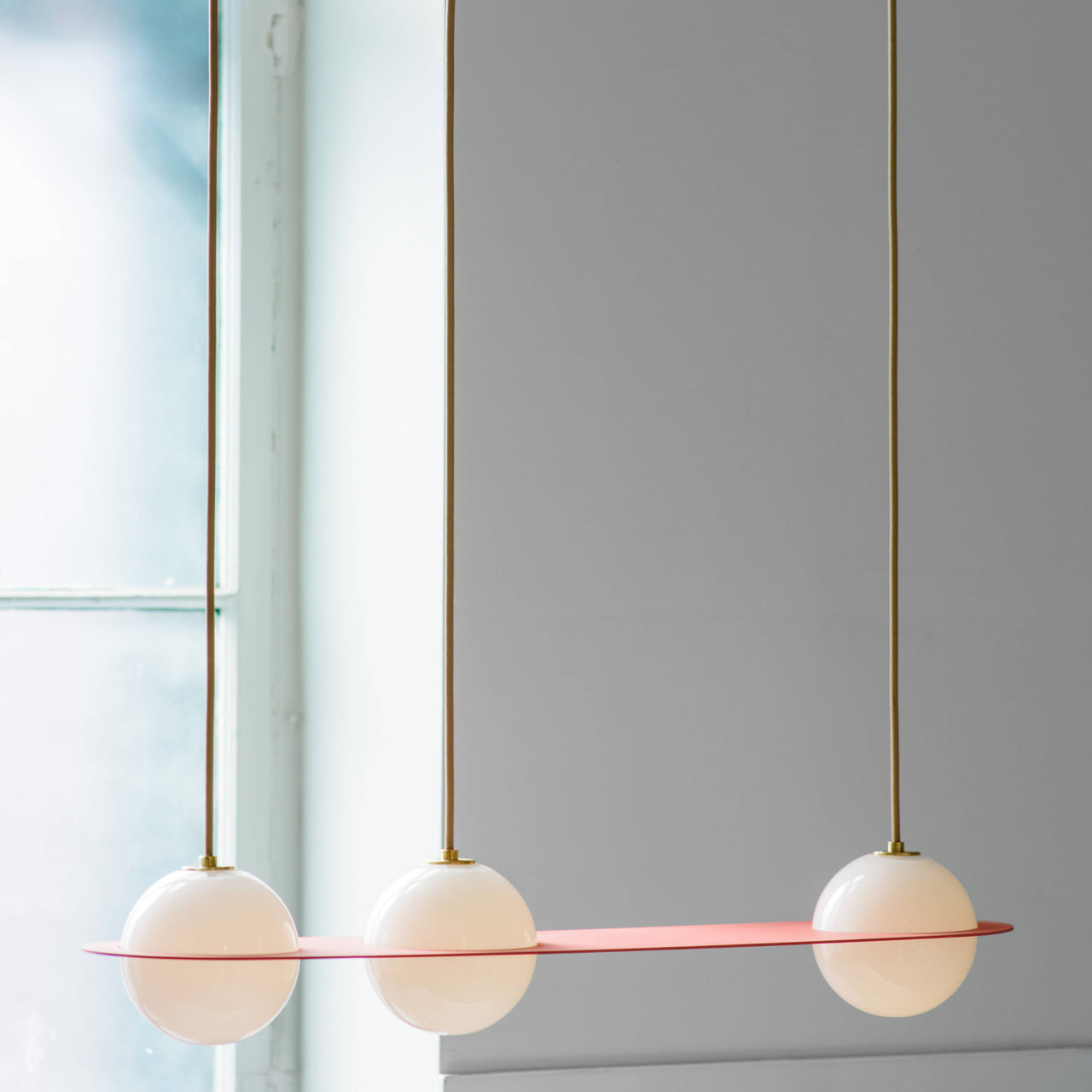 In an intriguingly off-kilter arrangement, Laurent 07 sees 3 of the series' hallmark milk glass globes seemingly sliced by a metal plane. The handblown opaline forms provide warmly diffused points of LED light in a structure that comes in an appealing choice of polished brass, nickel-plate or powder-coated colored aluminum. Offered in either an angled- or parallel-mount model, the suspension lamp is handmade at the brand's Montreal atelier.