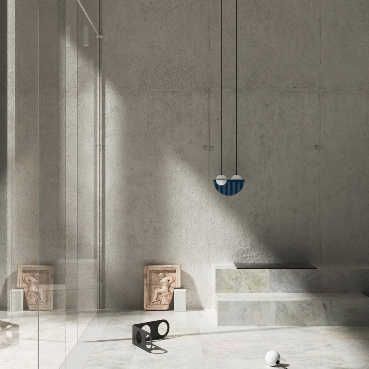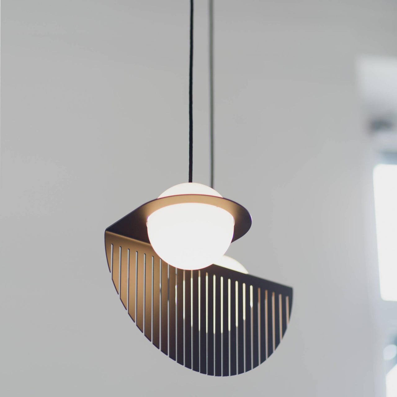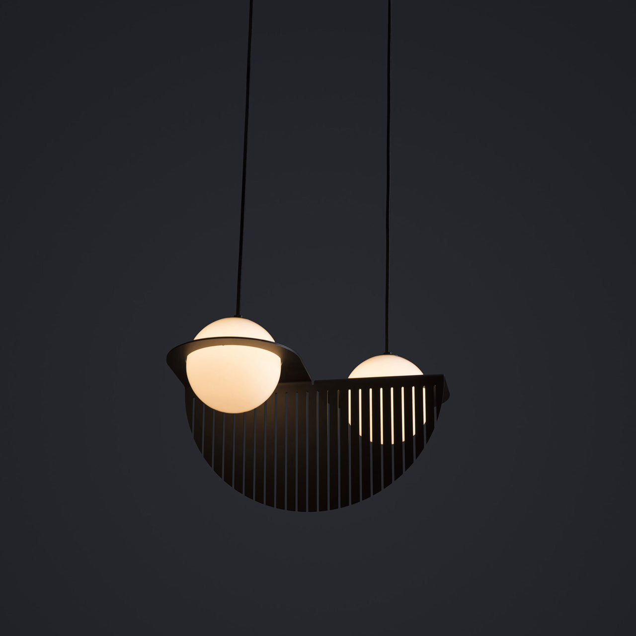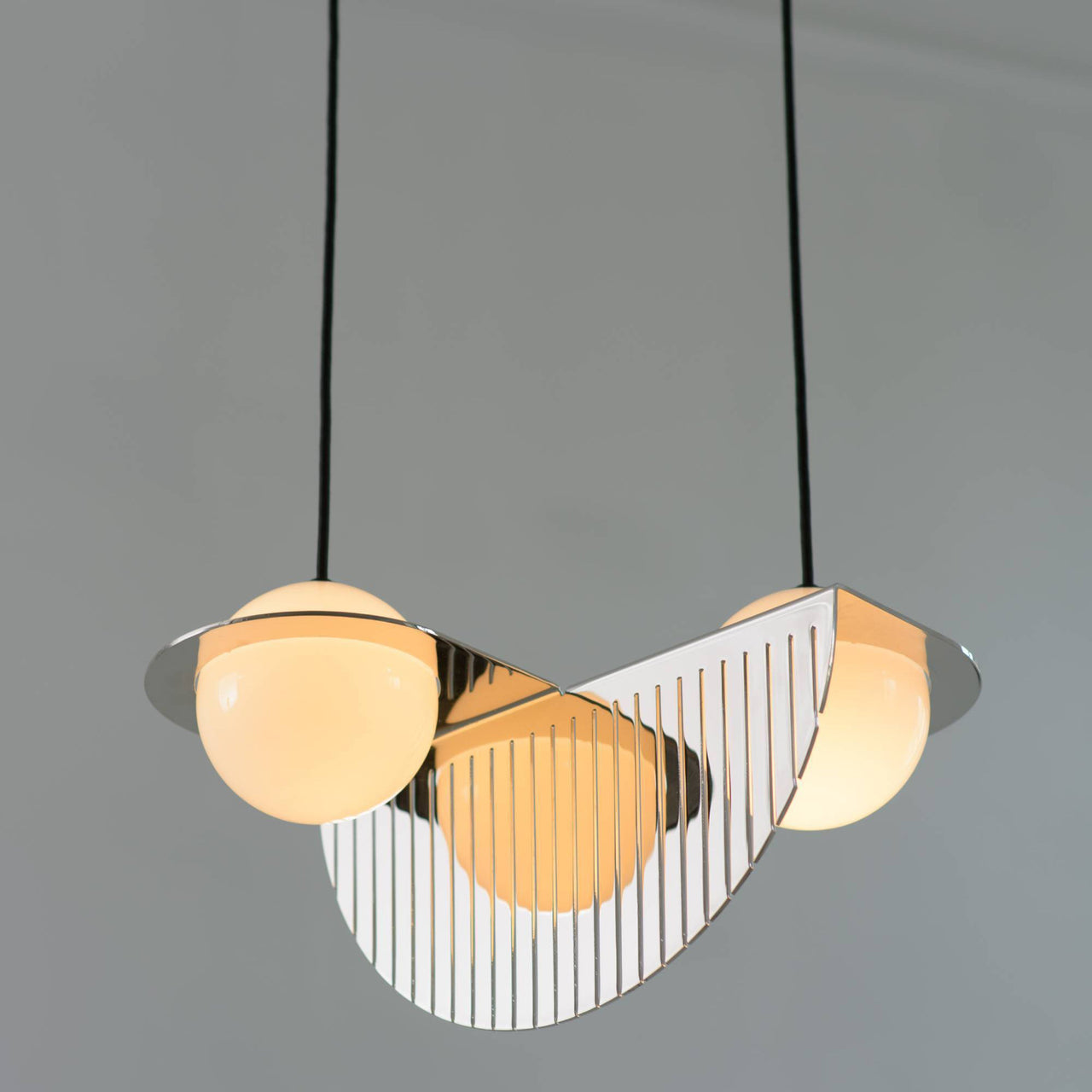 Laurent 09 alters the collection's essential relationship between a metal circle and a sphere by allowing light to pass through its striated form. With illumination diffused by dual handblown opaline glass globes, the folded structure proves a complementary element in a choice of polished brass, nickel-plate or powder-coated colored aluminum. Available in either angled- or parallel-mount versions, this atmospheric suspension lamp is handmade at maker Lambert & Fils' Montreal atelier.