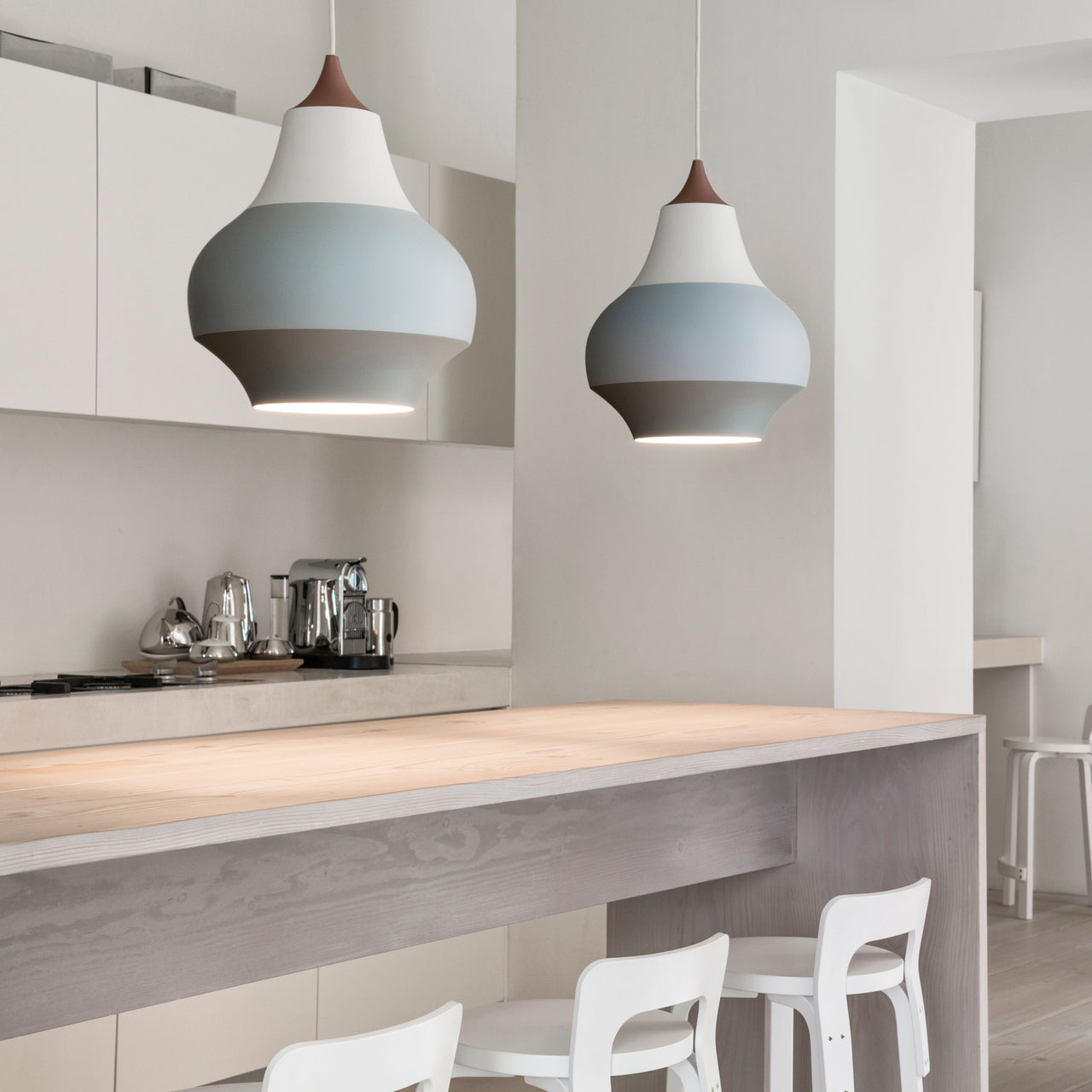 The Cirque Pendant draws inspiration from the lively atmosphere of Copenhagen's Tivoli Gardens. Its playful design reflects the colors and motion of balloons, carousels, and spinning objects. The distinct bands of color create a continuous effect, much like colors in circular motion. The shape of the pendant is reminiscent of the onion-shaped domes found on some of Tivoli's buildings, further enhancing its whimsical character. Available in various color combinations and sizes.