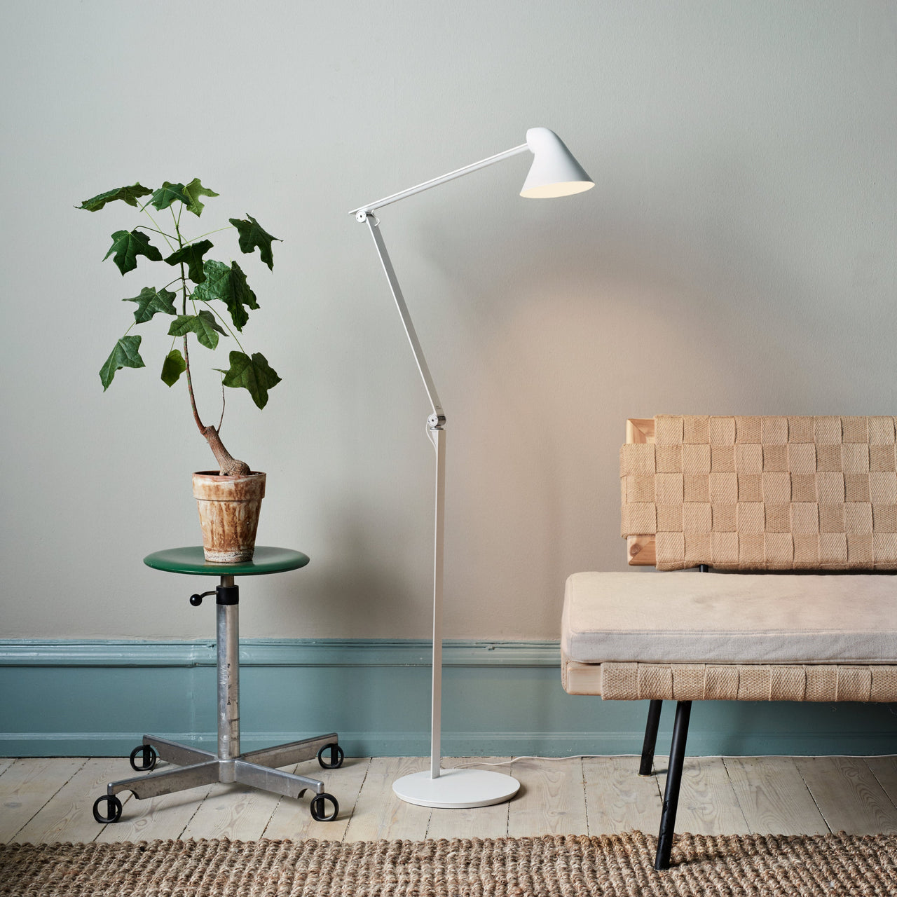 The NJP Floor Lamp by Louis Poulsen, designed by Oki Sato of nendo, reimagines the classic anglepoise lamp for modern living. Its sleek, adjustable design is perfect for reading or task lighting, with a flexible head and arms that allow for precise light placement. The lamp features an integrated LED light source, thoughtfully positioned to reduce glare. A unique chimney-shaped head also reflects light backwards, subtly illuminating the top of the arm while dissipating heat.