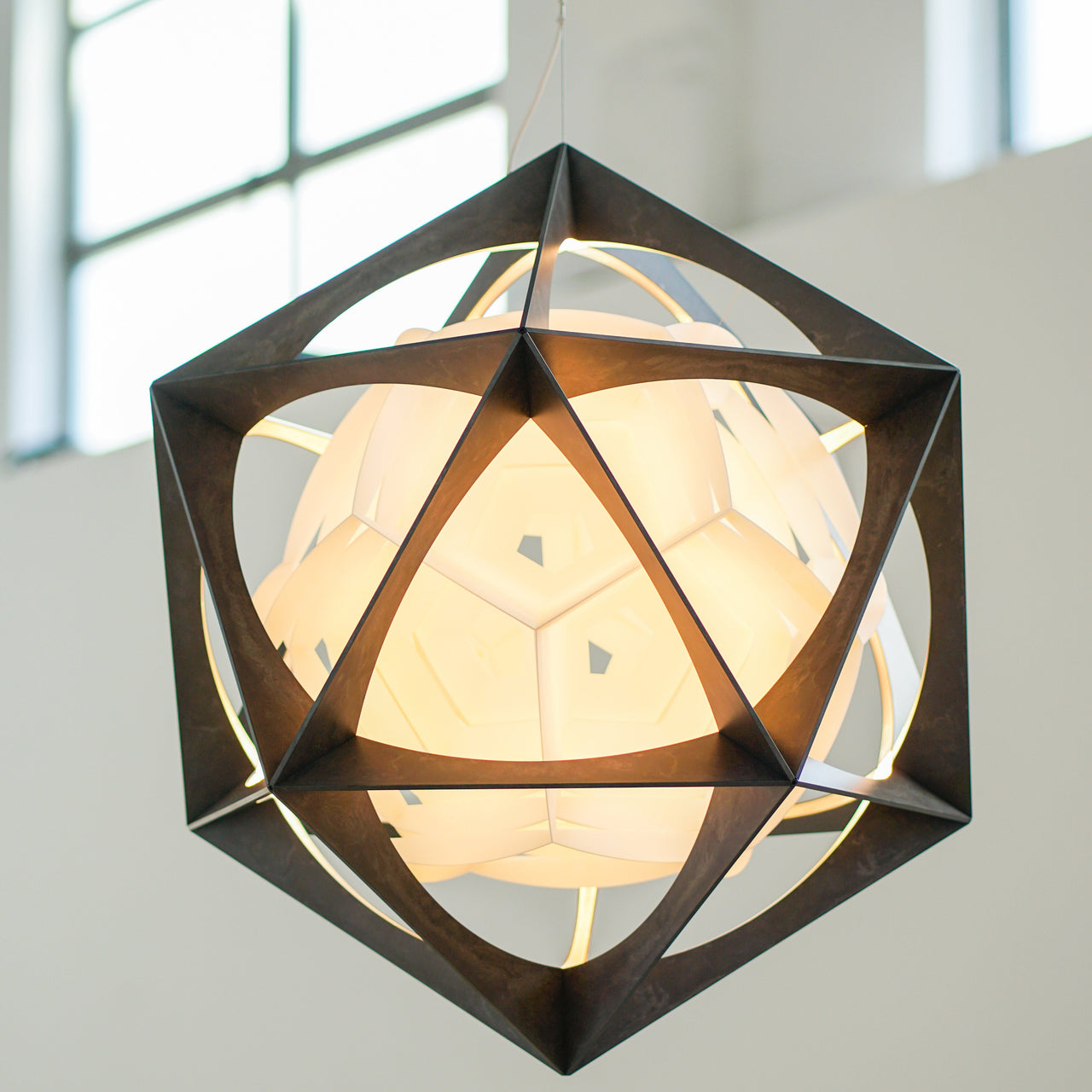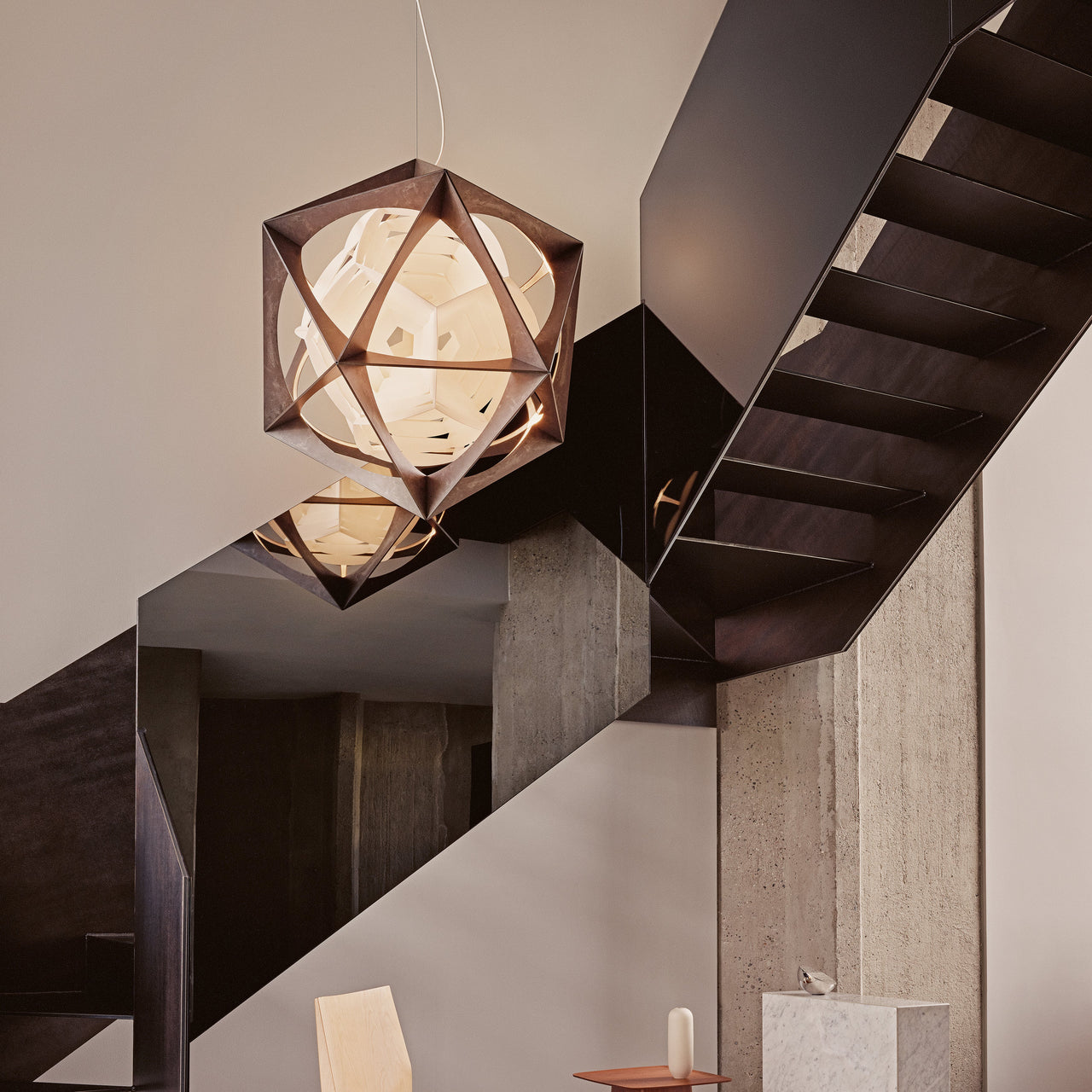 The OE Quasi Pendant by Louis Poulsen, designed in collaboration with renowned Icelandic-Danish artist Olafur Eliasson, features two interlinked geometric shapes. The design incorporates embedded LED lights within the vertices of the aluminum frame, directing light towards the reflector to create a spherical, glare-free illumination. Sustainability is a core element of the OE Quasi, with 90% of the aluminum being recycled and all materials being fully recyclable.