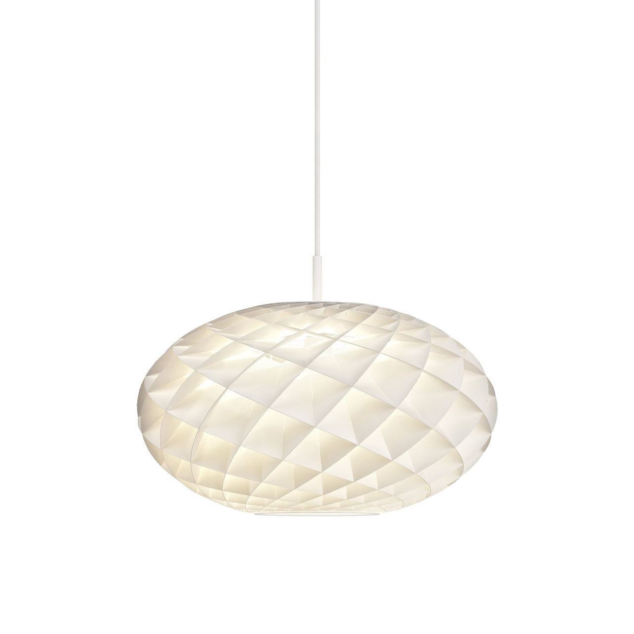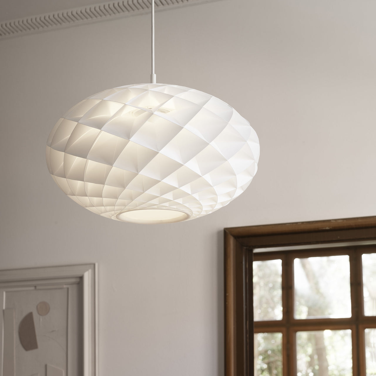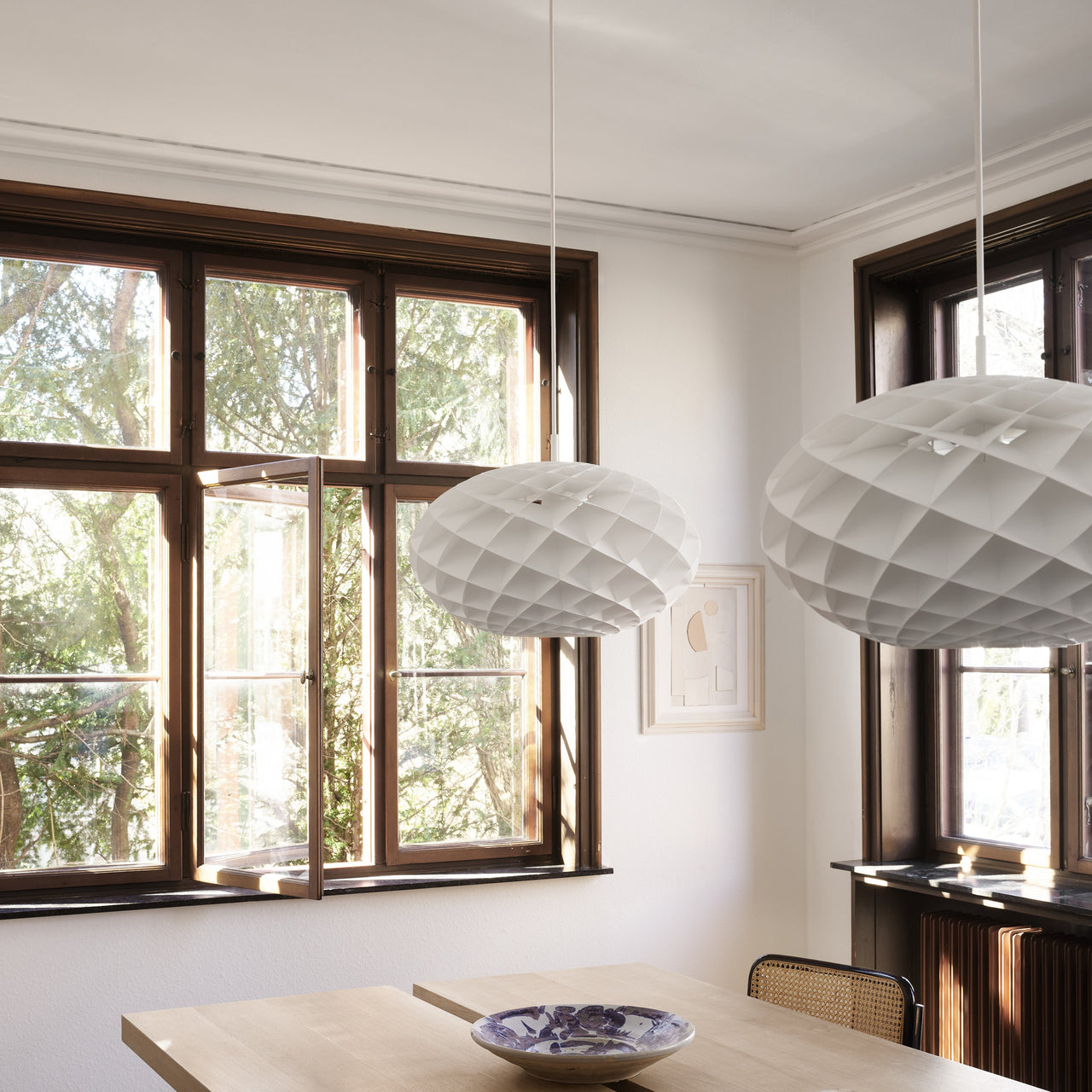 The Patera Oval Pendant, designed by Øivind Slaatto, is inspired by the Fibonacci sequence, creating a captivating ellipsoid form. The pendant features meticulously crafted diamond-shaped cells that provide 360-degree glare-free illumination, making it a stunning centerpiece from every angle. A circular opening at the base directs soft, downward light, ideal for dining areas or low-ceiling spaces.