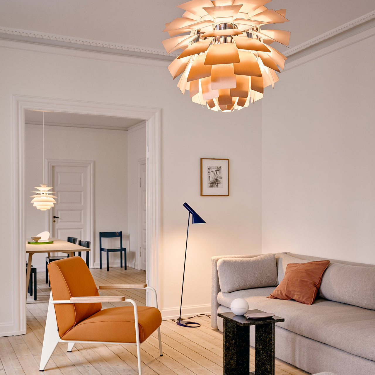 Breathtaking in form, the extra-large version of PH Artichoke, like its sister pendants, features 72 precisely positioned leaves in concentric rows to provide glare-free light from any angle. Still largely made by hand, Poul Henningsen’s sculptural circa-1958 design, now powered by an LED, is offered in a range of metallics or a powder-coated finish.