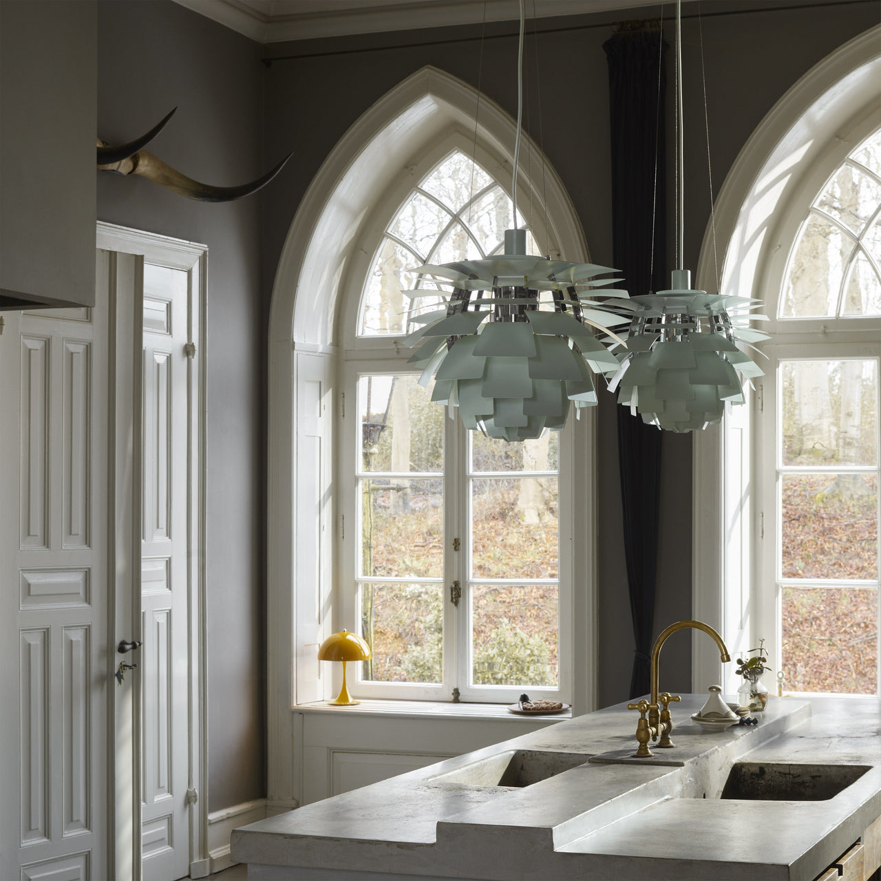 With the arrival 2 decades later of designer Poul Henningsen came 2 of the most collectible and coveted Midcentury modern fixtures, the PH-5 and the “Artichoke.” The stable of now-legendary designers widened with the likes of Vilhelm Lauritzen, Arne Jacobson and Verner Panton. The output wasn’t all stunning form either. During WWII, the firm contrived a blackout lamp that allowed famed Tivoli Gardens in Copenhagen to remain open in the evenings, without interfering with the fighter jets in the skies above.