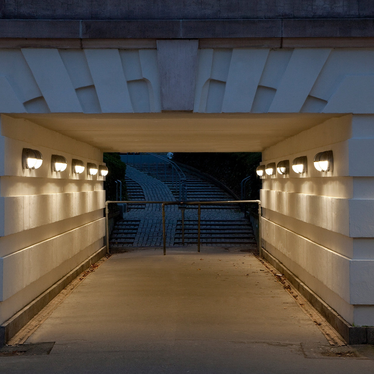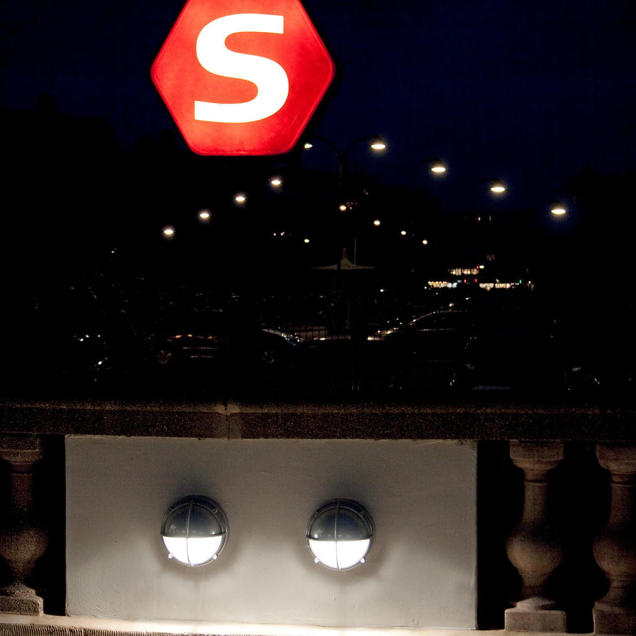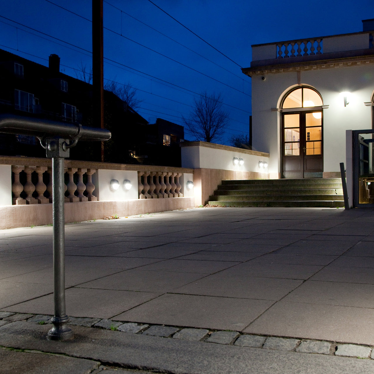 Skot was designed in the early 1900s by Lauritz Knudsen for ships and maritime areas, but its compact, sturdy utility translates easily to other outdoor uses. In die-cast aluminum with an injection-molded, opal polycarbonate diffuser, the fixture is available in full or half-shaded versions and either natural painted aluminum or a powder-coated silver finishes.