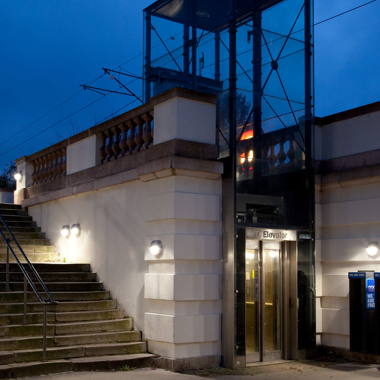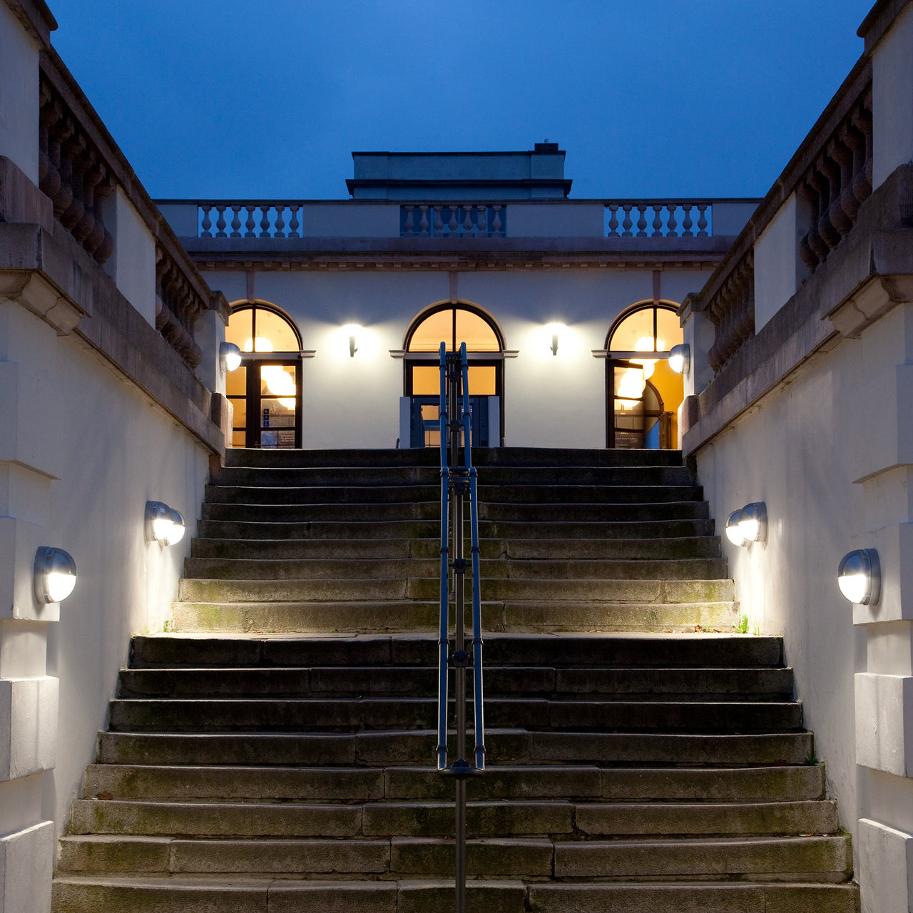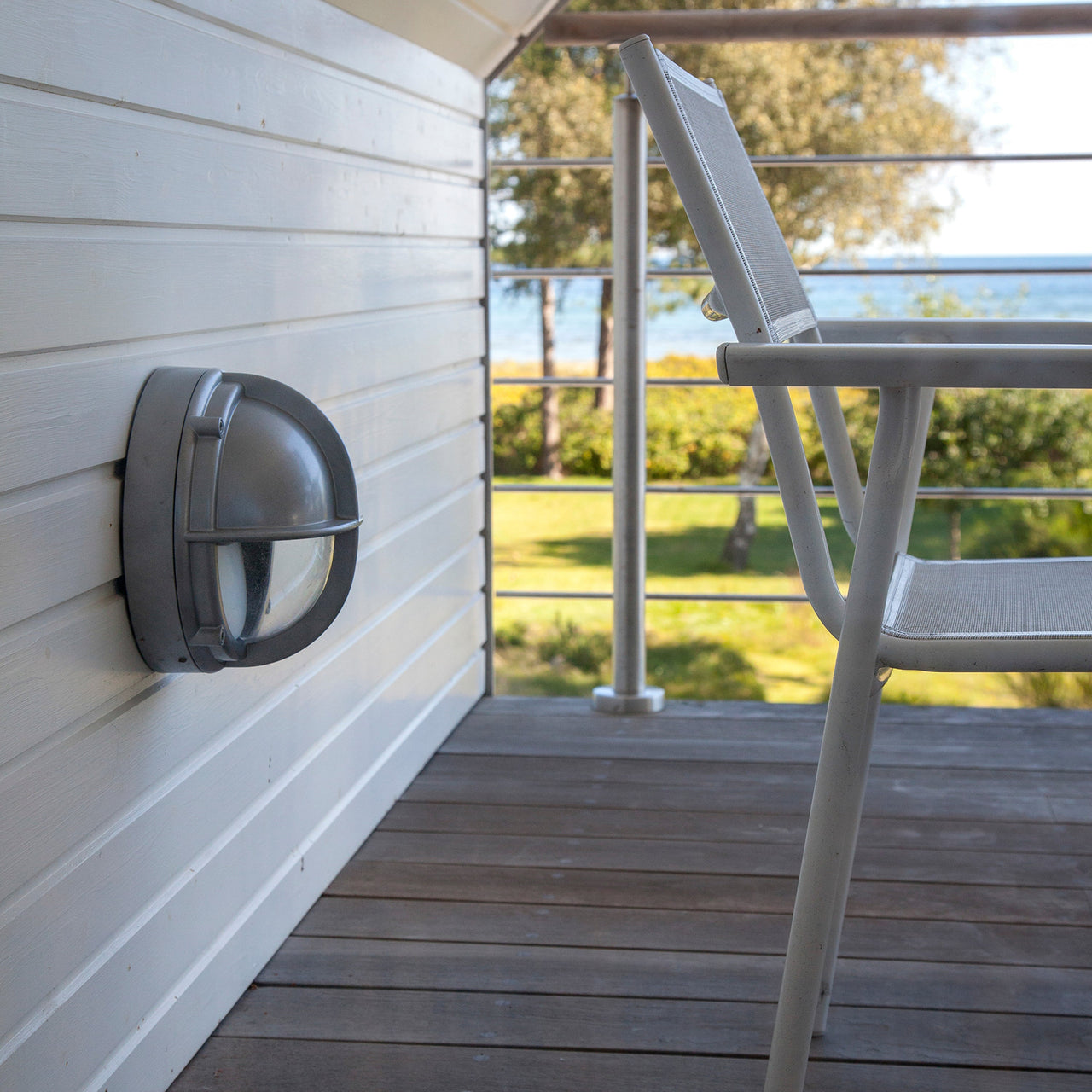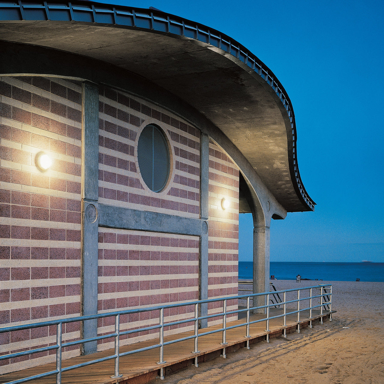Skot was designed in the early 1900s by Lauritz Knudsen for ships and maritime areas, but its compact, sturdy utility translates easily to other outdoor uses. In die-cast aluminum with an injection-molded, opal polycarbonate diffuser, the fixture is available in full or half-shaded versions and either natural painted aluminum or a powder-coated silver finishes.