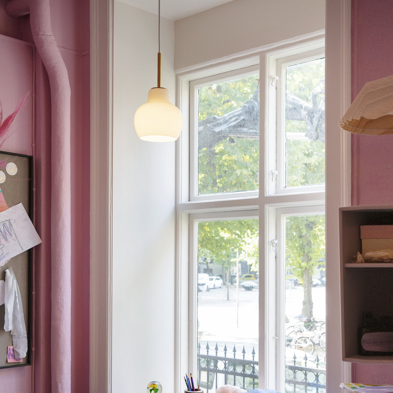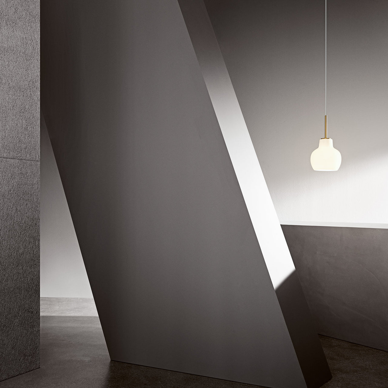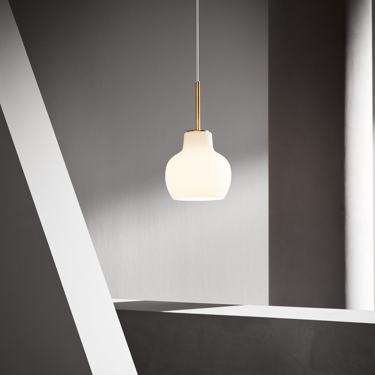 As a versatile single pendant adapted from architect Vilhelm Lauritzen’s original 1940s design for the Danish Broadcasting House, VL Ring Crown radiates charm as well as warm illumination. With its distinctive polished white shade in handblown, triple-layered opal glass, it has a discreet white cord and an untreated, polished brass suspension.
