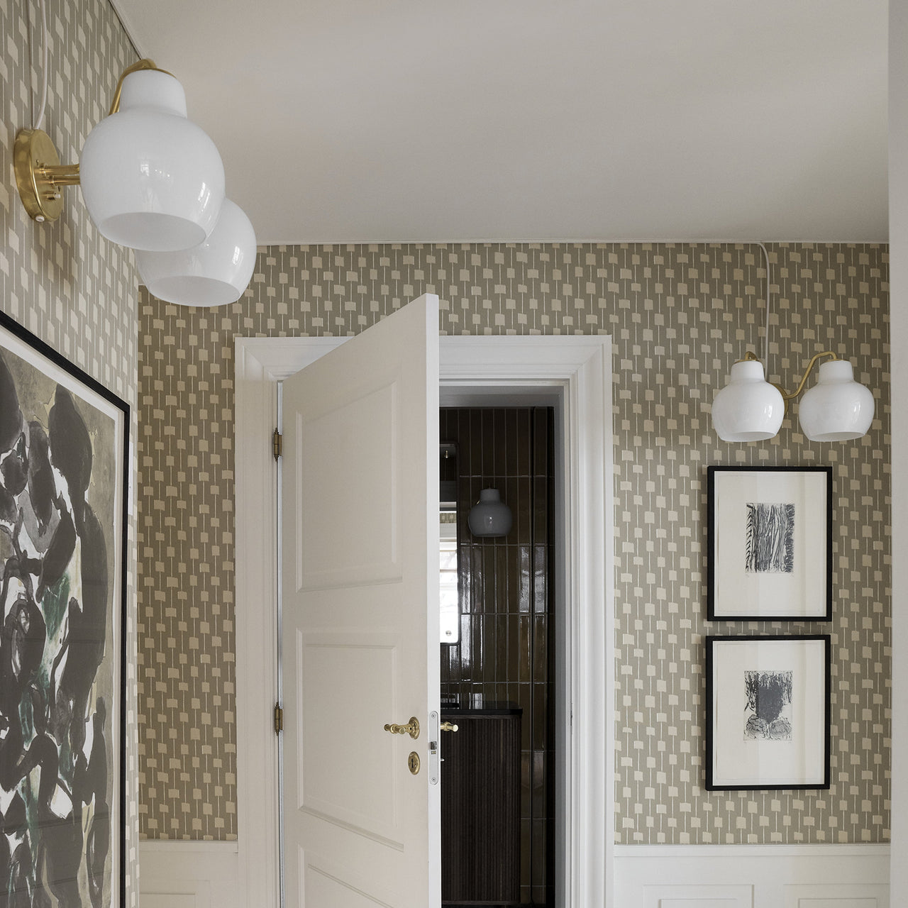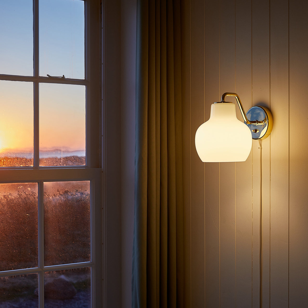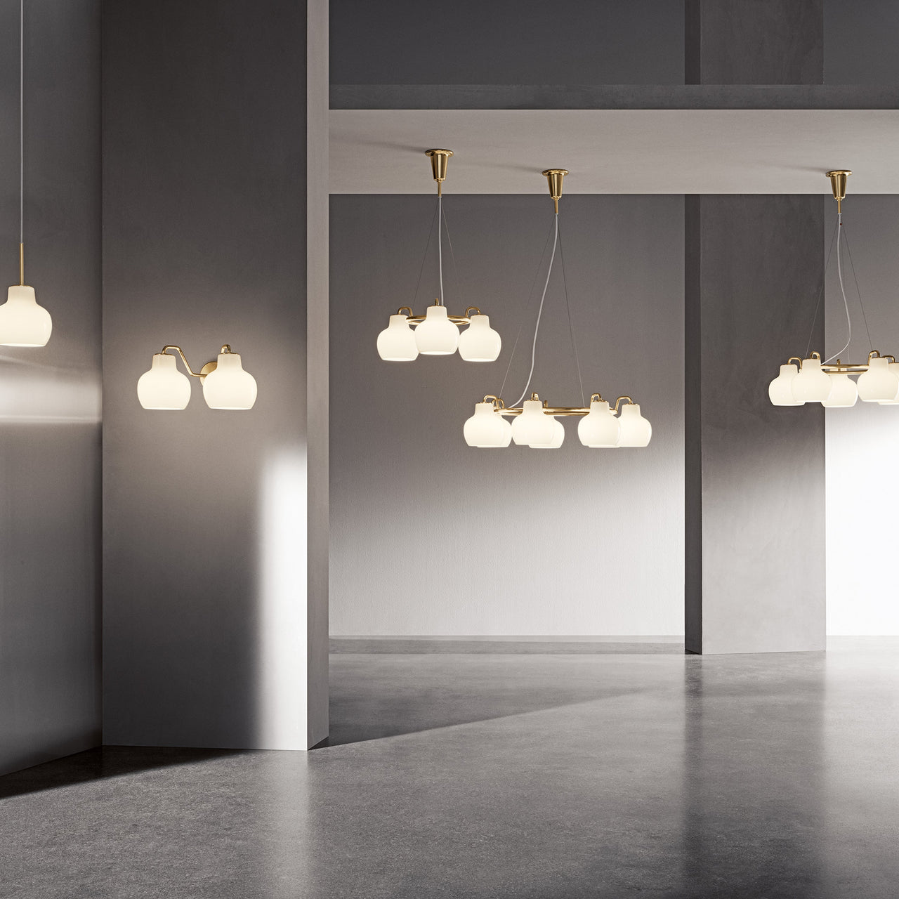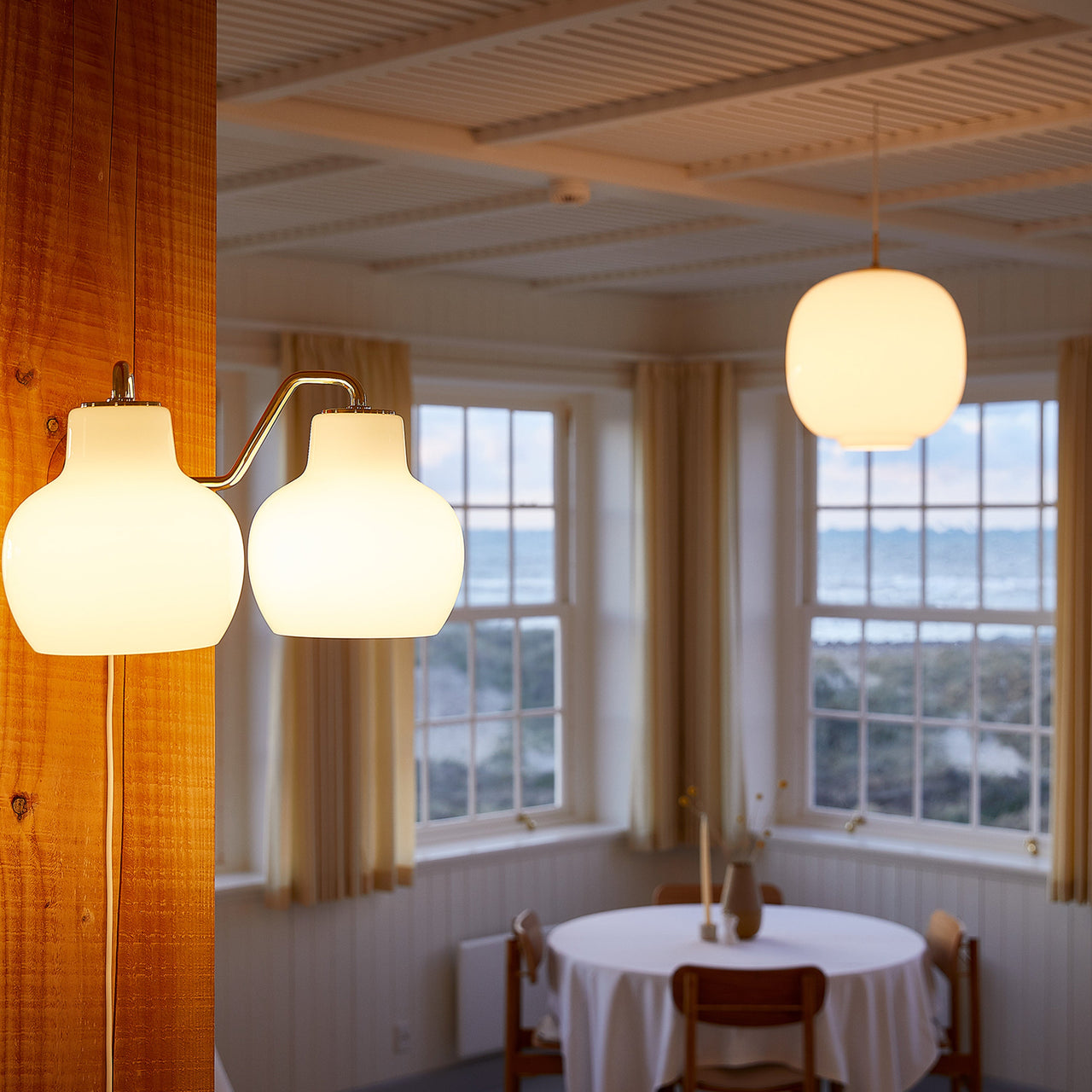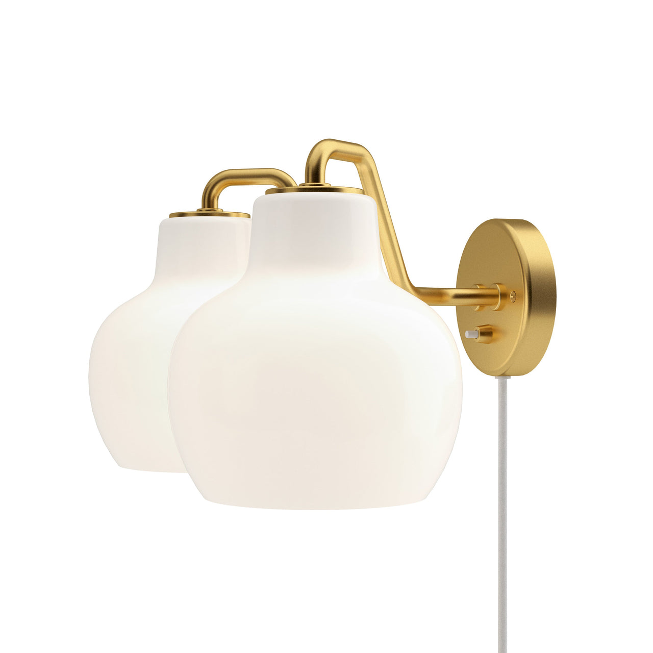 In a choice of single or double versions, architect Vilhelm Lauritzen’s wall lamp made of untreated, polished brass features a glossy white shade design in triple-layered handblown opal glass. Spun off from an original 1940s design for the Danish Broadcasting House, VL Ring Crown lights the way with warm illumination and memorable style.