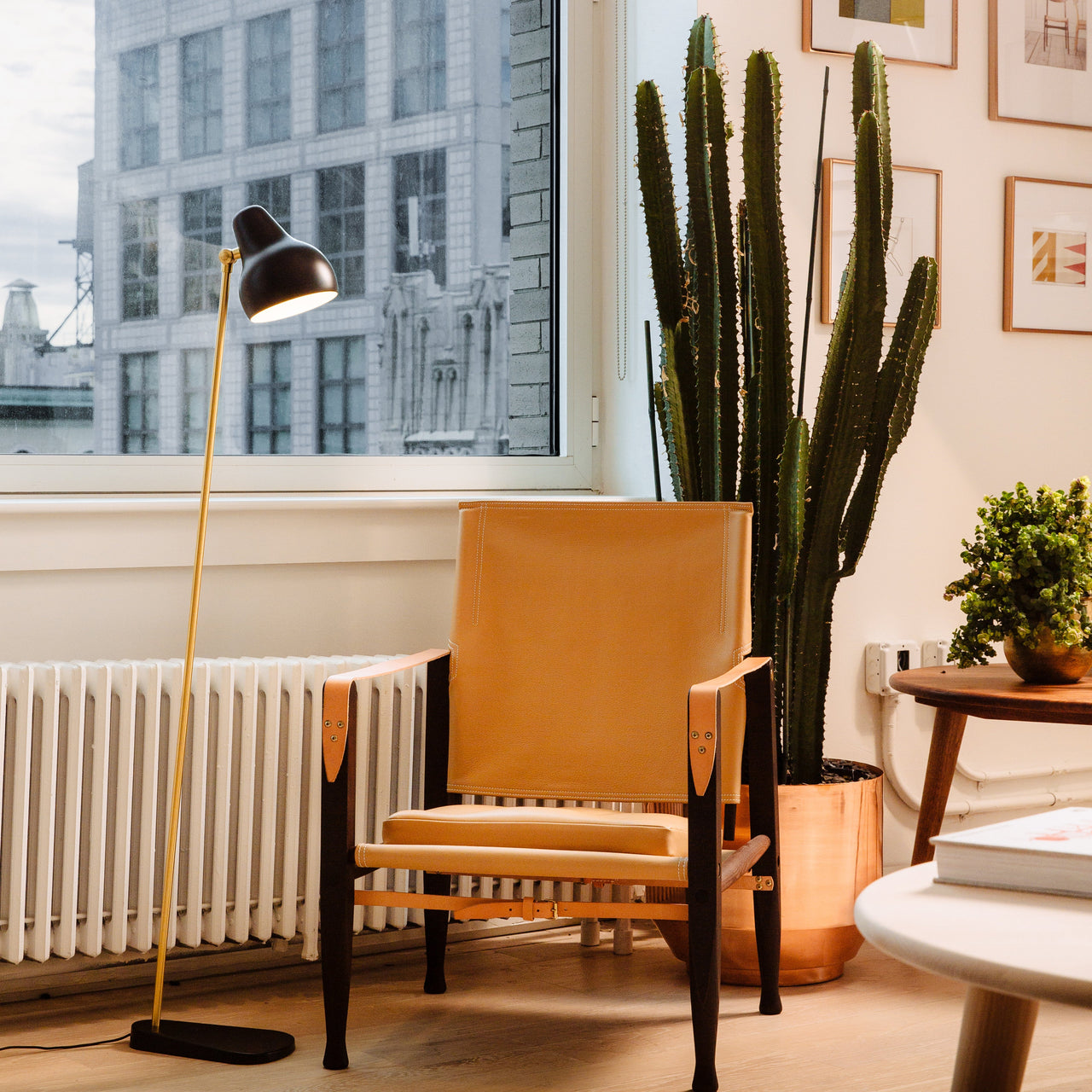 The VL38 Floor Lamp is a beautifully minimalist piece designed by Vilhelm Lauritzen for Copenhagen's Radiohuset building. Featuring a sleek combination of a white, angled shade and a brushed brass arm, this lamp provides focused, downward lighting, perfect for reading or ambient illumination. The head is adjustable, allowing you to direct light where needed, and the inside of the shade is painted white for soft, even light. Updated with modern LED technology, the VL38 combines vintage charm with energy efficiency.