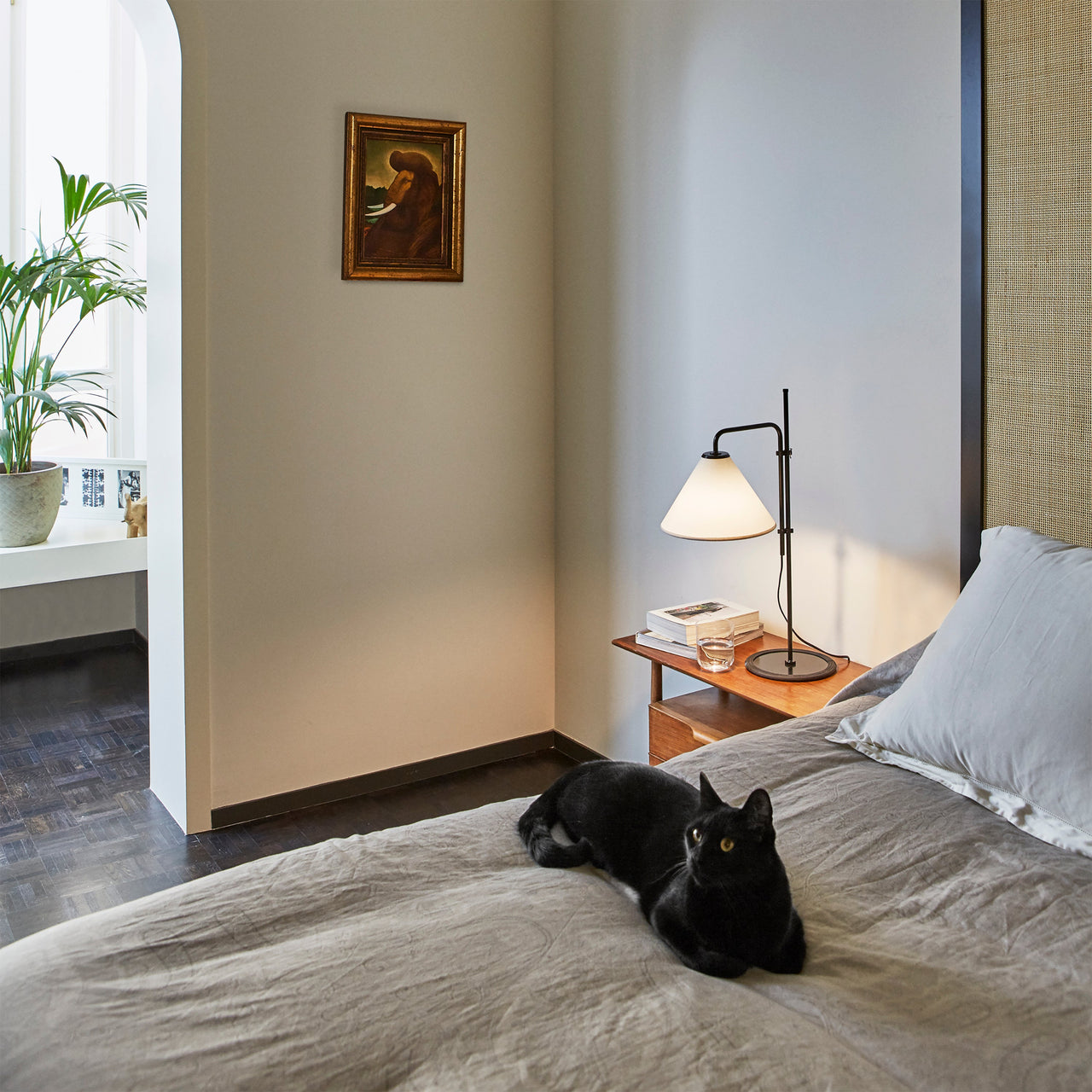 Marset’s emblematic height-adjustable Funiculí adds a version with a fabric shade, first conceived in 1979 by Lluís Porqueras. Illumination is gently filtered through the shade for an overall glow and the light can be raised or lowered, secured via a simple pair of clips. With the lamp in black lacquered iron, the shade is available in a choice of white or beige translucent laminated film.