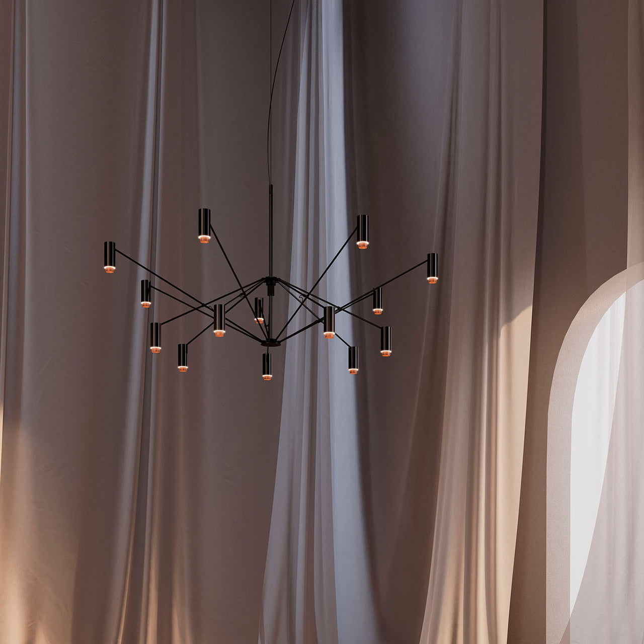 W might as well stand for wondrous with Marset’s flexible, large-format pendant from Valencia design duo PerezOchando. Arrayed with 14 spotlights, the inky black structure can be folded up or extended to provide uniform illumination in any space. The choice of gold, ivory or terracotta-colored rings surrounding each bulb will vary the chromatic glow.