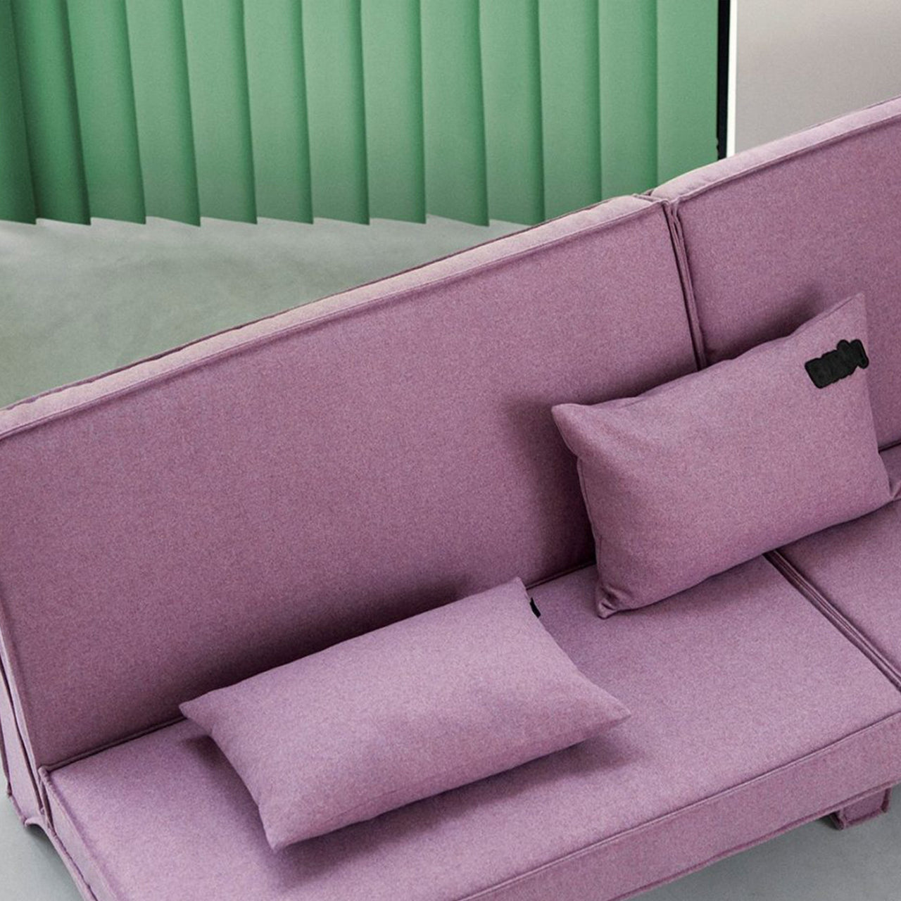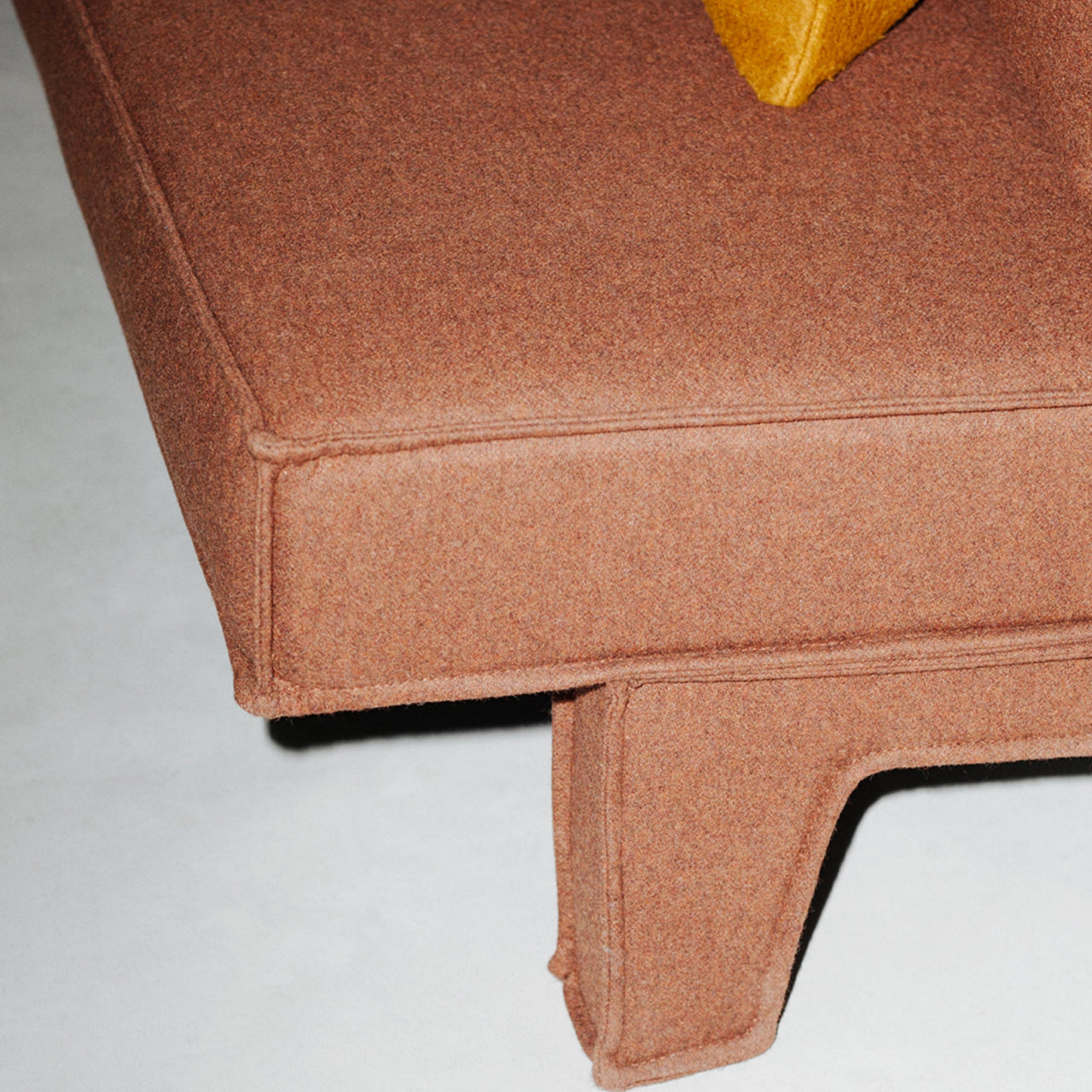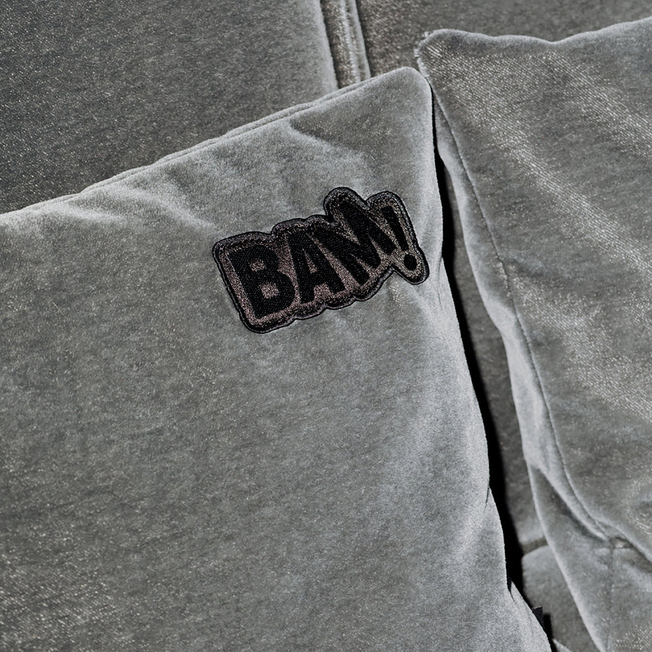 Just as the Pop movement stunned the art world, BAM! shakes up the idea of a sofa, here in an extended version that combines a pair of 2-seater sections. Massproductions co-founder and chief designer Chris Martin plays up the geometry of block-shaped cushions for the armless seat and back, filled with recycled goose and duck feathers (sterilized via high temperature without chemicals). Buttress-like legs come upholstered in the same material and one of the back cushions sports a black embroidered logo patch, a nod to the American artist Roy Lichenstein. BAM! is delivered in eco-smart flat packaging and easily assembled with few components.