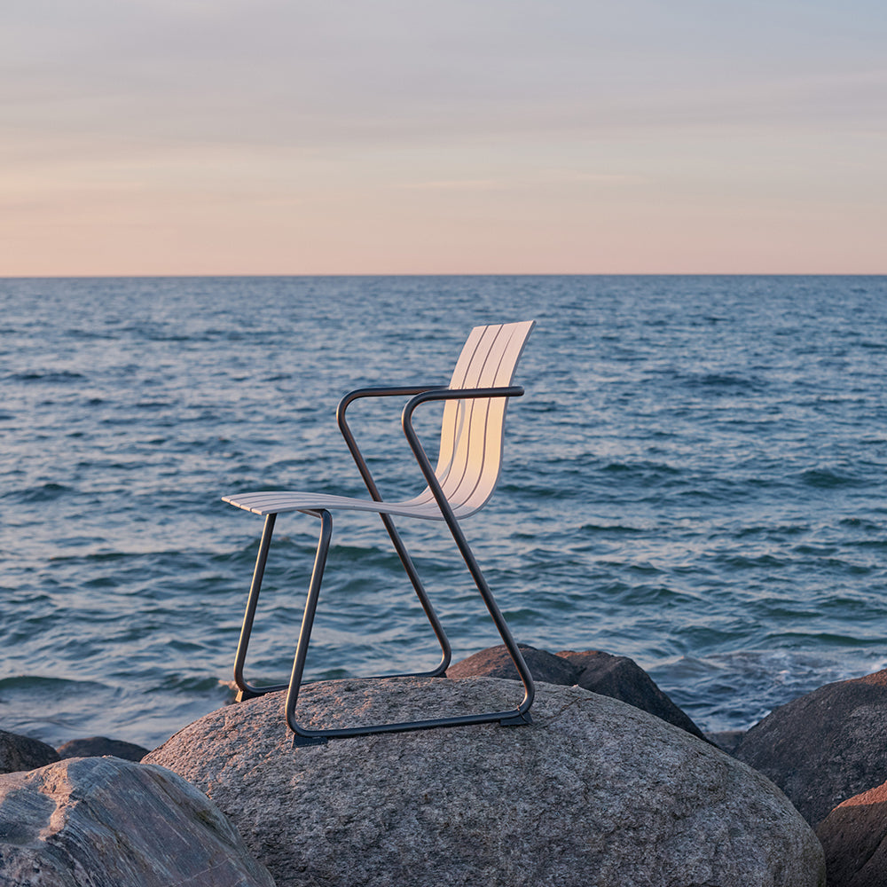 Celebrated Danish design duo Nanna and Jørgen Ditzel were known for pioneering new materials and that spirit infuses Mater’s eco-conscious reimagining of their 1955 chair. Ocean’s slatted contours, originally fashioned in wood veneer, are composed of used fishnets (primarily from Denmark’s west coast) and recycled hard plastic—each one using 960 grams of ocean plastic waste. With its steel frame in a gunmetal finish, the seating comes in black or sand hues and is made and tested for outdoor use as well. Such sustainable thinking is a hallmark of the Mater brand and was honored with a 2019 Wallpaper Design Award.