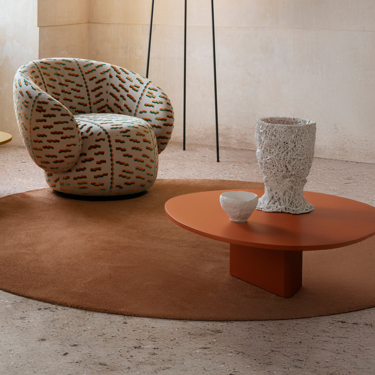 The Albio Coffee Table features an irregularly rounded top set on a faceted triangular base, creating a sculptural presence. Available in finishes such as Travertine marble, wood veneers, or lacquered colors, it offers a range of choices to fit various settings. Designed by Skrivo, the table combines organic shapes with geometric details and is available in 3 sizes.