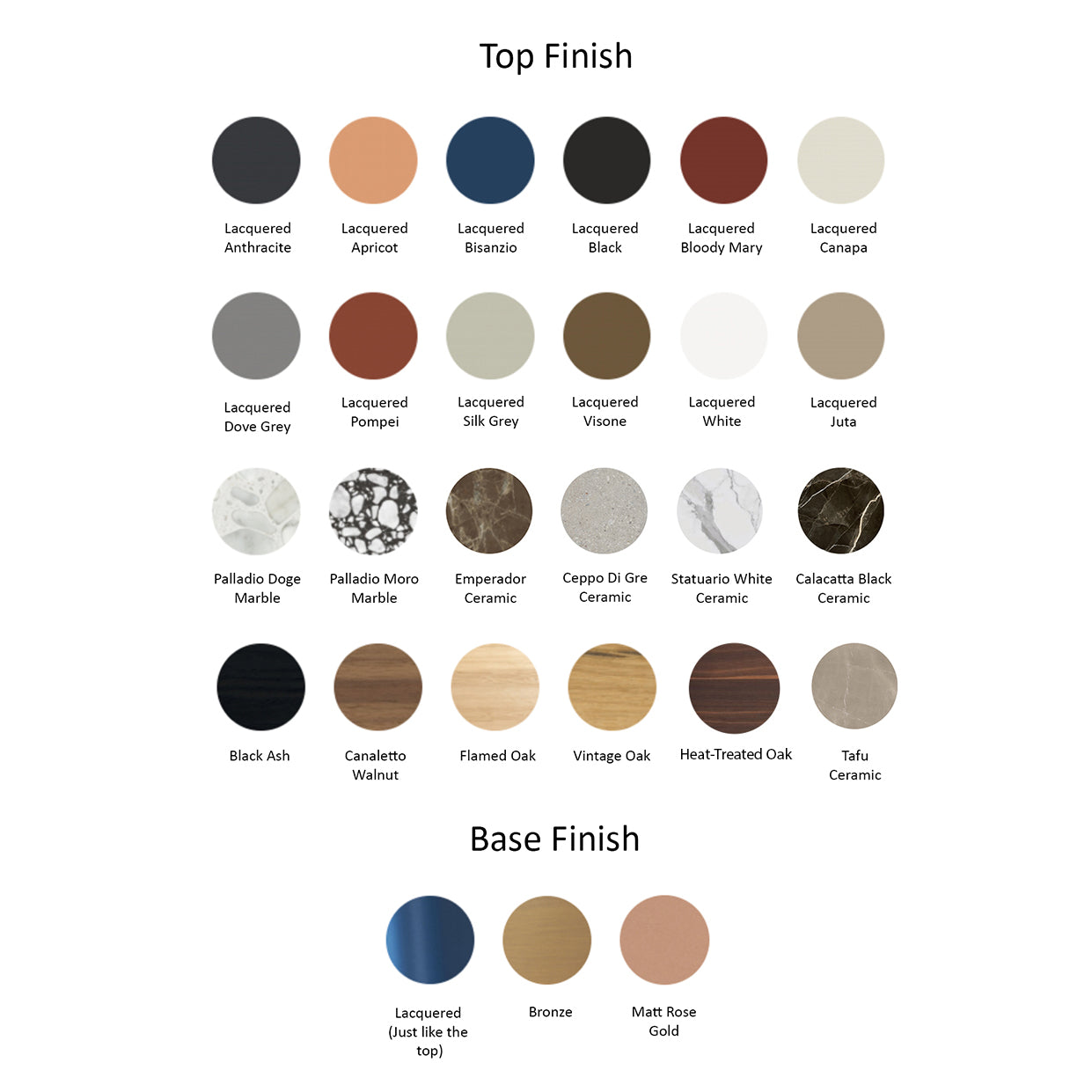 More base finishes, such as Lacquered Anthracite, Apricot, Bisanzio, Bloody Mary, Canapa, Dove Grey, Pompei, Silk Grey, Visone, and Juta are available upon request.