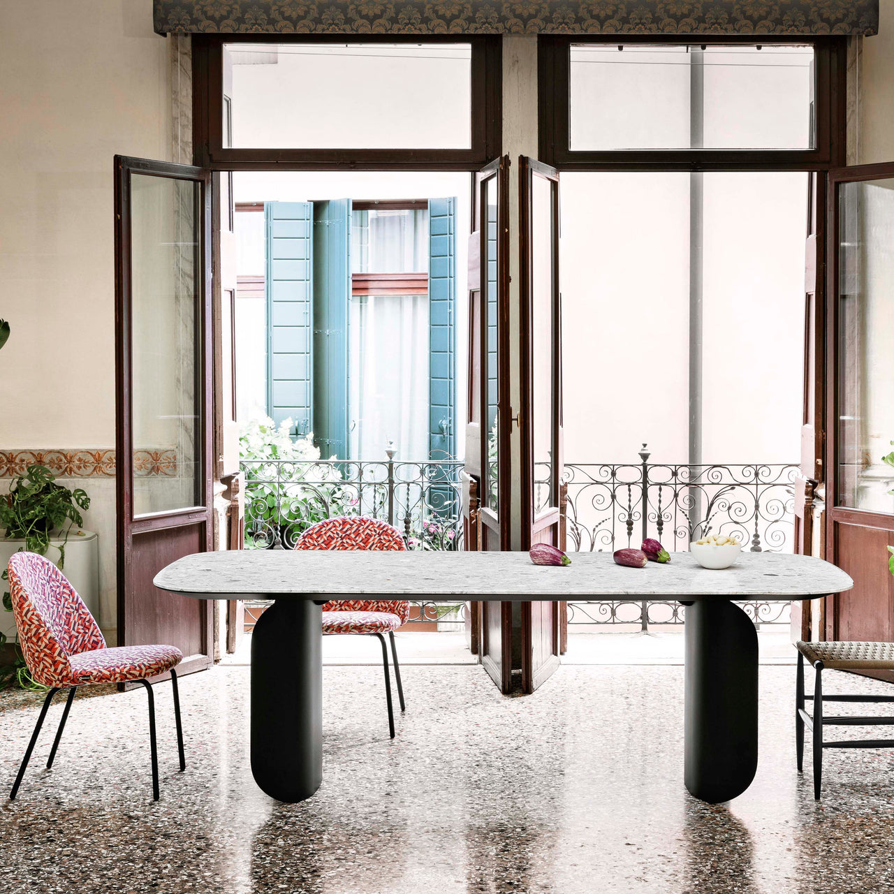 In a medium version to seat up to 6 persons, Miniforms adapts Barry, with its "potato chip" metal legs that curl distinctively around themselves to form a dramatic fillip. Finished in a choice of lacquer or metallic finishes, the dual structure gives an intriguing contrast of proportions when paired with the sliver-like tabletop. With a range of surface choices in rich woodgrain, lacquer finish, a travertine-like ceramic or Palladio marble varieties, the table is a refined standout in either the home or office.