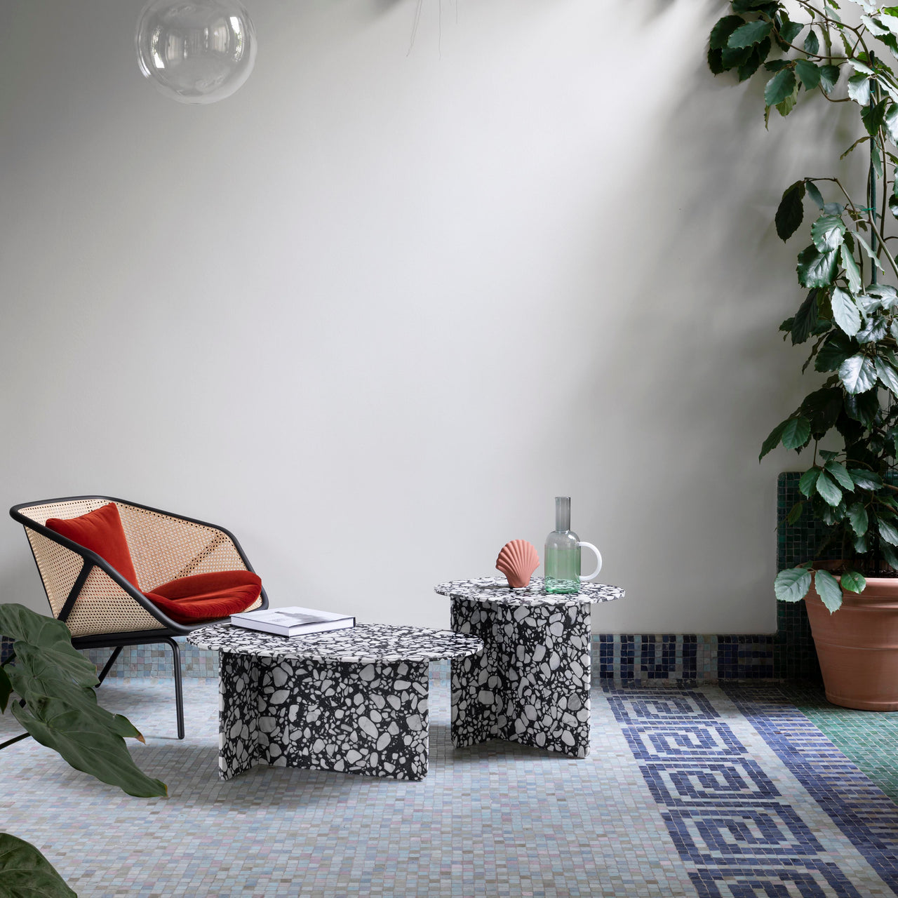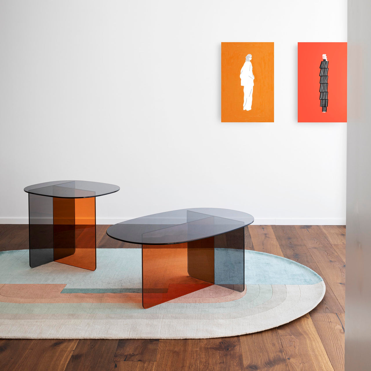 Chap by Matteo Zorzenoni is a pair of occasional tables that share a geometric base in the same material as the curving tabletop. Fashioning the table entirely in Palladio Moro marble invites a meditation on the weighty form and unique patterning of the stone. Alternately, the version in orange and grey glass strikingly melds a colorful tint with the smoky transparency.