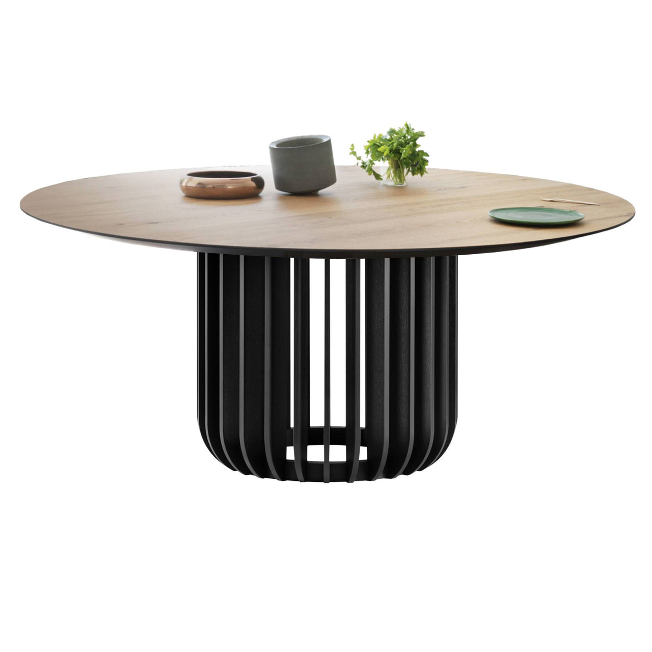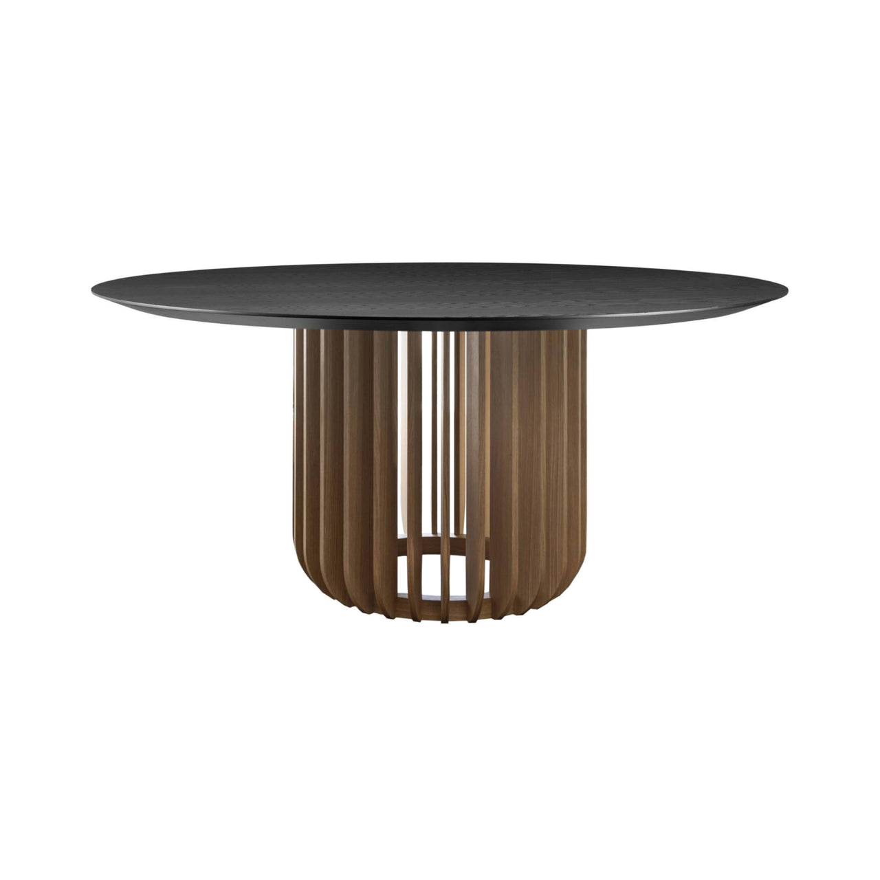 With a circular design said to be suggested by a juicer, this round dining table by E-ggs for Italian maker Miniforms nonetheless projects an atmosphere of appealing calm. Balancing positive and negative space with its encircling slatted wood base gives Juice a lightness that tempers its grand proportions. The impressive round tabletop comes in a selection of solid-wood finishes or a porcelain ceramic in a range of marbleized variations.