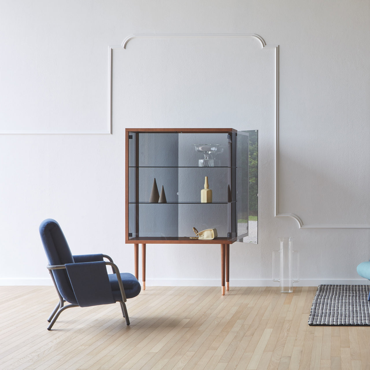 Simply exquisite, Juno is a standout update of the classic vitrine, with elegantly tall legs, geometrically squared proportions and minimalist detailing. The Florence design E-ggs has composed a striking structure fashioned of smoky grey glass with clear shelves to match, in order to display all manner of collectables. The glass box is framed and set on a base of solid wood, in a selection of rich lacquer finishes with coppery accents.