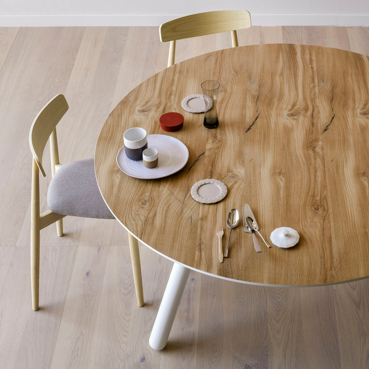 In a compact version, Pixies 3-legged look has a playful, child-like air. That first impression belies the sophistication of its round tabletop in an exposed woodgrain, a ceramic that mimics marble or a completely lacquered hue, with legs that are similarly lacquered to match or rendered in natural ash or aniline wood finishes. Conceived by Miniforms Labs in-house team and made in Italy, the table owes its beautifully simple appeal to its superb workmanship.