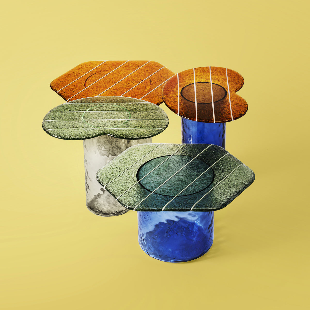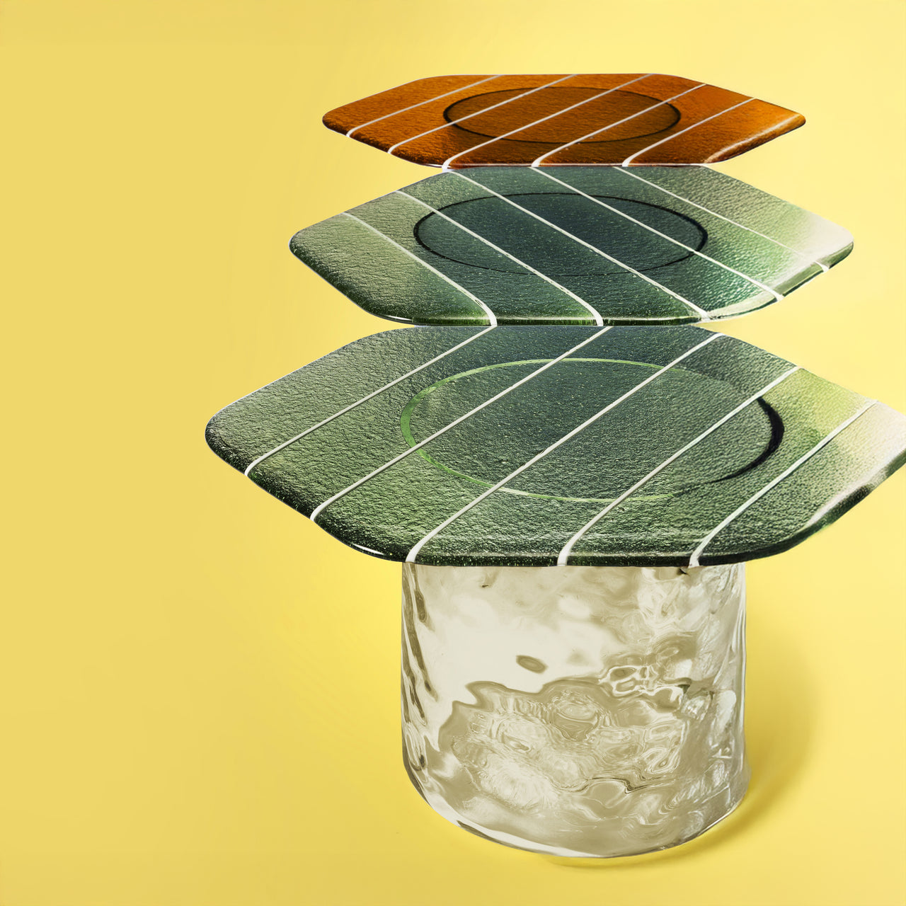 A vibrant, candy-like surface and intricate craftsmanship define this coffee table, offering a striking focal point in any space. The Striche Coffee Table features a top made from Murano molten glass, shaped through a meticulous four-pour process that gives it its distinctive color, texture, and pattern. Set atop a minimalist base, the table is available in glass finishes, bringing brightness and material depth to interiors.
