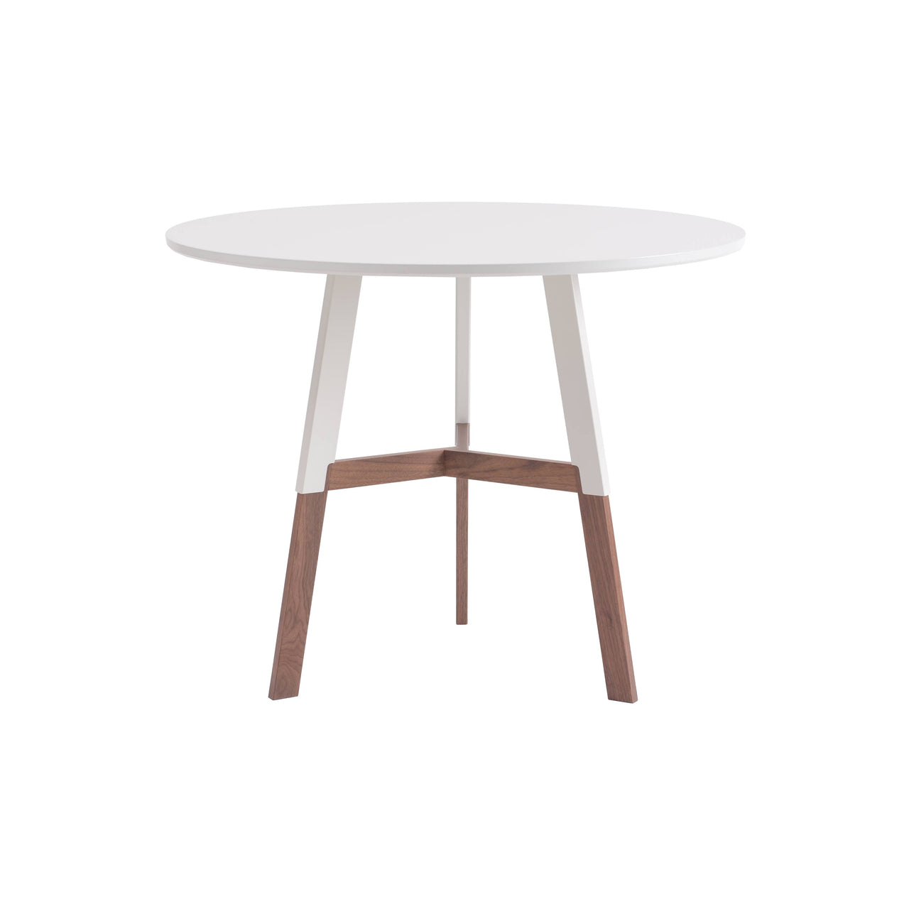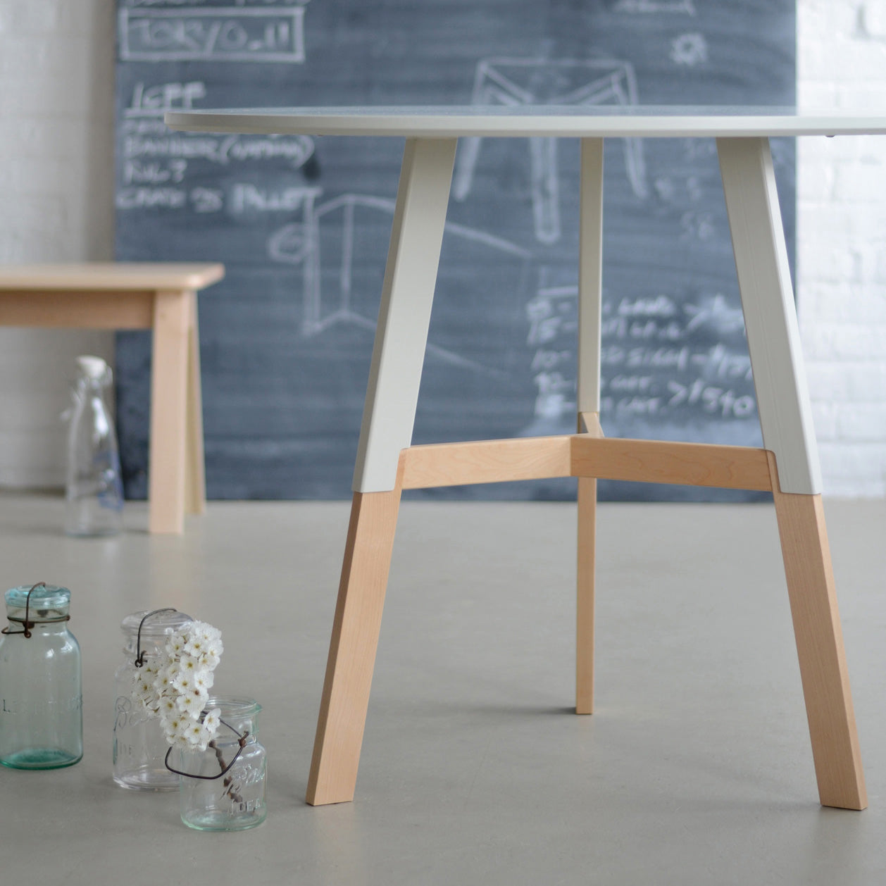 With 1/2 Nelson, Misewell focuses on a modern take on the classic café table. The brand's vision boasts a durable powder-coated tabletop in crisp white to match the upper leg sleeves. Below, sustainably forested solid maple or walnut forms the base’s handcrafted lower half—all tied together with a unique pinwheel joint.
