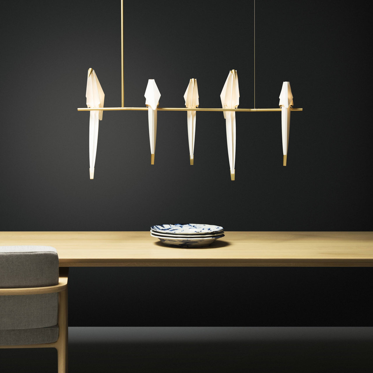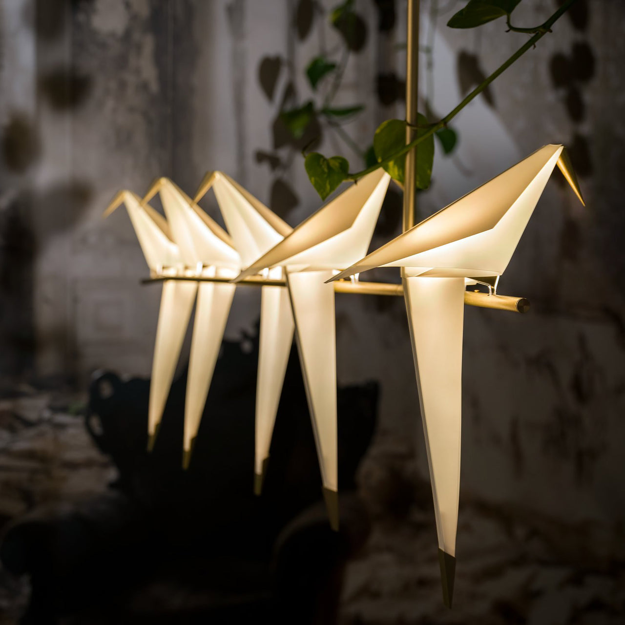 Birds of a modernist feather flock together in British designer Umut Yamac's elegantly imagined LED lighting array. With poetic precision, he fashions the gently glowing synthetic paper creatures that perch on a metallic branch, with golden beaks and trails of precious metal in the feathers of their tails. And these sunlit birds are free to swing when softly touched, completing the altogether captivating effect.