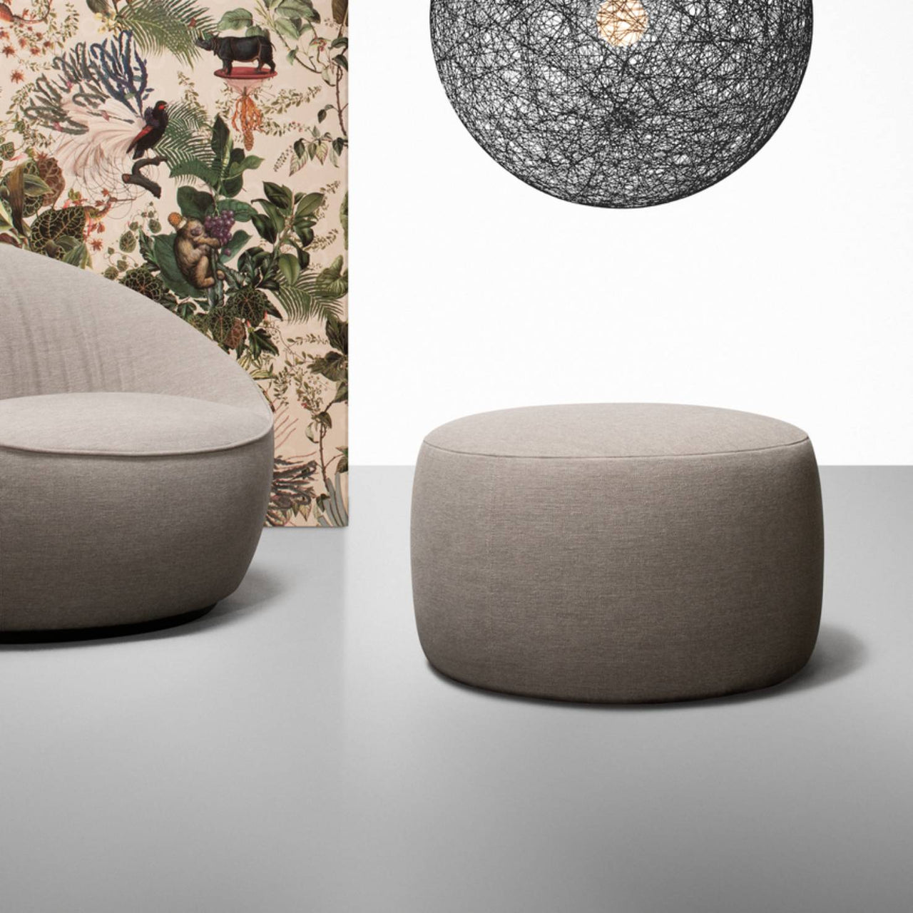 Moooi goes Pooof in a compact version of its versatile ottoman. With a pleasing round shape that complements nearly any sofa., it easily shifts from serving as a footrest to extra seating. With a soft but solid touch, the piece is fashioned in multiple density cut foam over a wood frame and upholstered in basic white fabric with a fabric or leather removable custom cover.