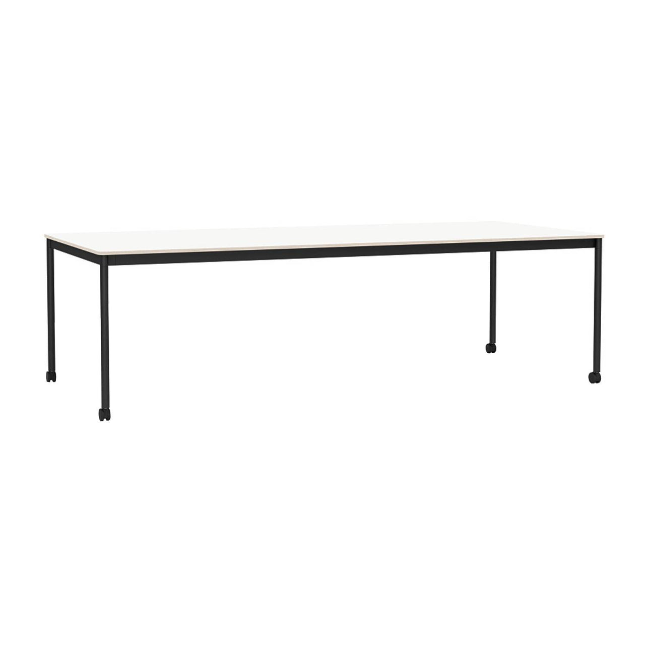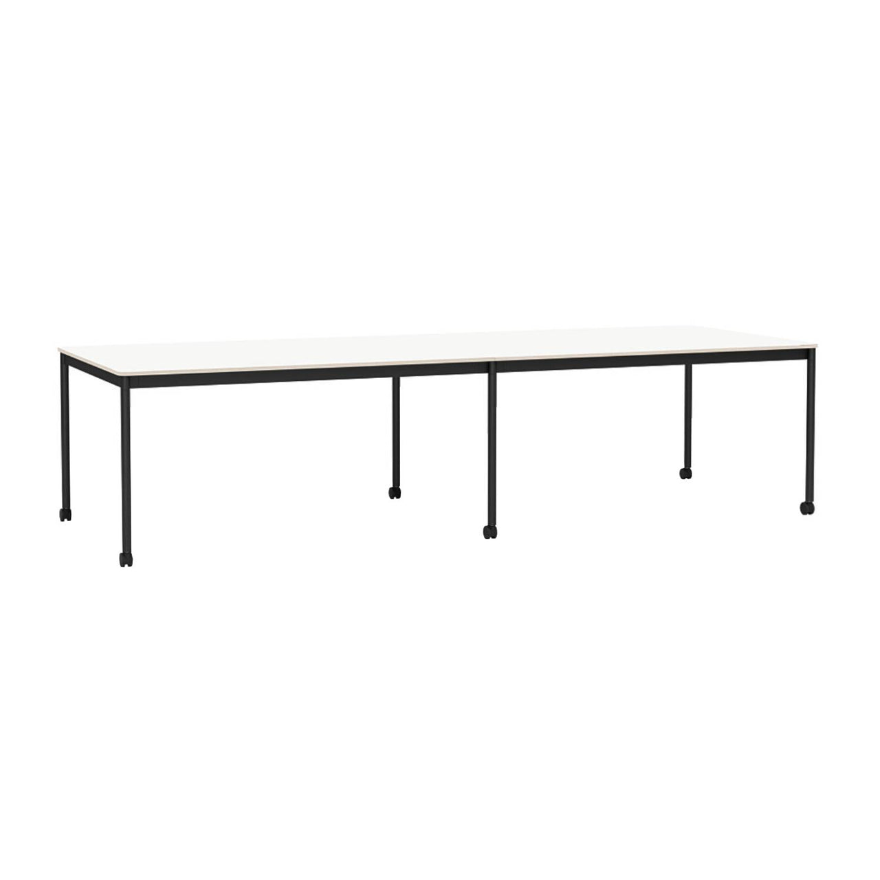 In supersize versions, each with a multiple-footlong expanse, Muuto’s signature table adds rolling castors to accommodate activities for a crowd with easy mobility. Finnish designer Mika Tolvanen’s rectangular Base finds use in the home, work area or public space with its strong but lightweight construction in extruded aluminum and an extra-durable acrylic paint finish. Tabletop choices include oak veneer, laminate and linoleum, all with a plywood edge; the laminate also offers an ABS plastic trim option.