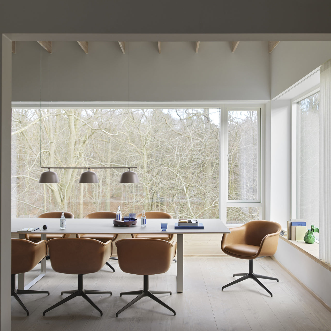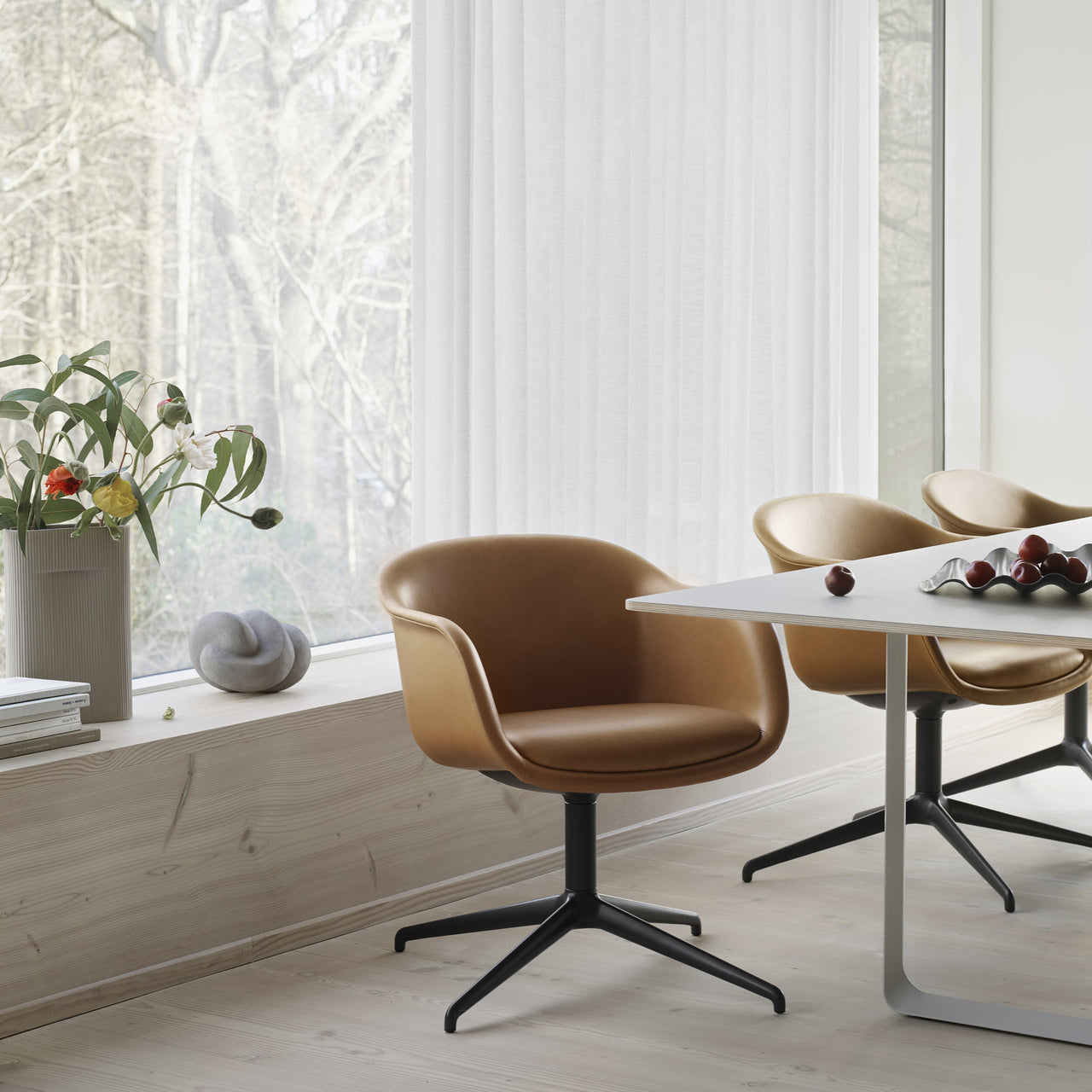 Whether set for the office or WFH, Muuto's sharp and clean-lined shell armchair with a swivel base and automatic seat return brings prime functionality, sustainability and an eye-catching presence. Fiber Conference Armchair's ergonomic contours are comfortable for long stretches of sitting, as engineered by Copenhagen-based design studio Iskos-Berlin. The seating's embracing inner shell is engineered in 99% recycled plastic and then fully upholstered with a soft fixed cushion.