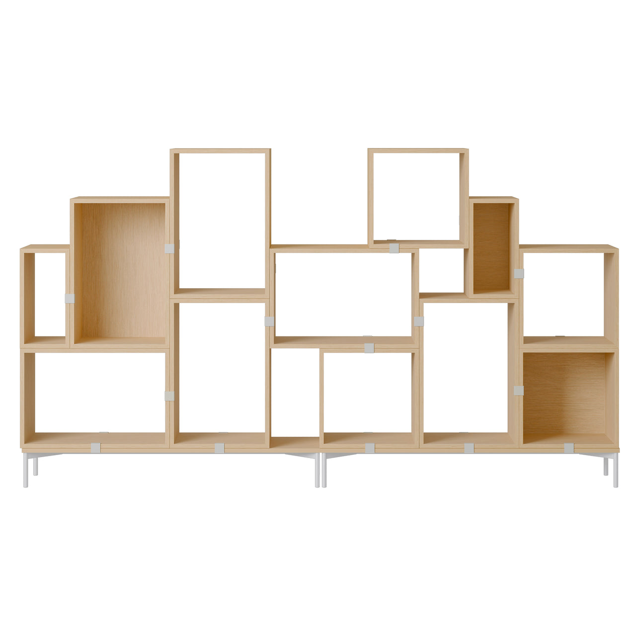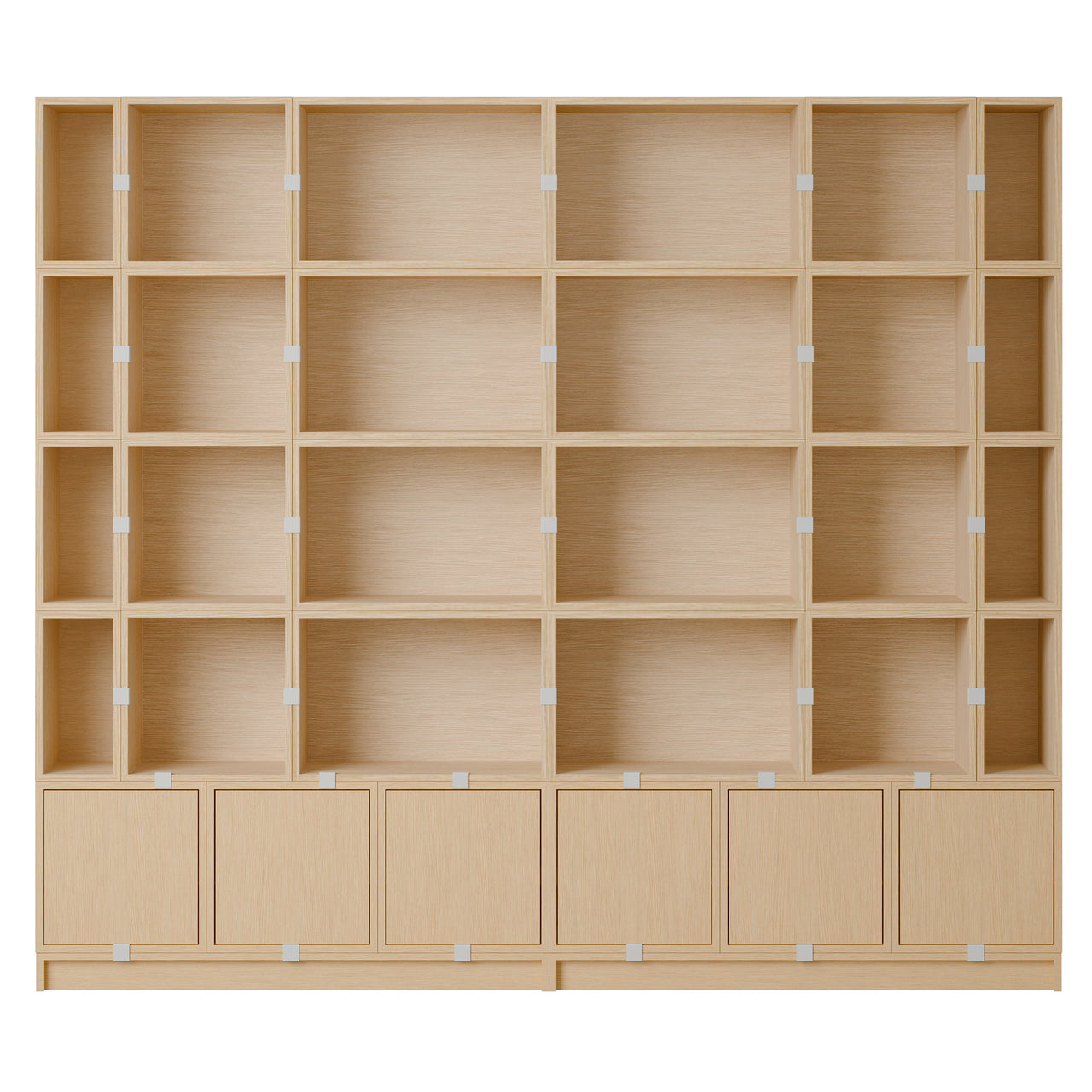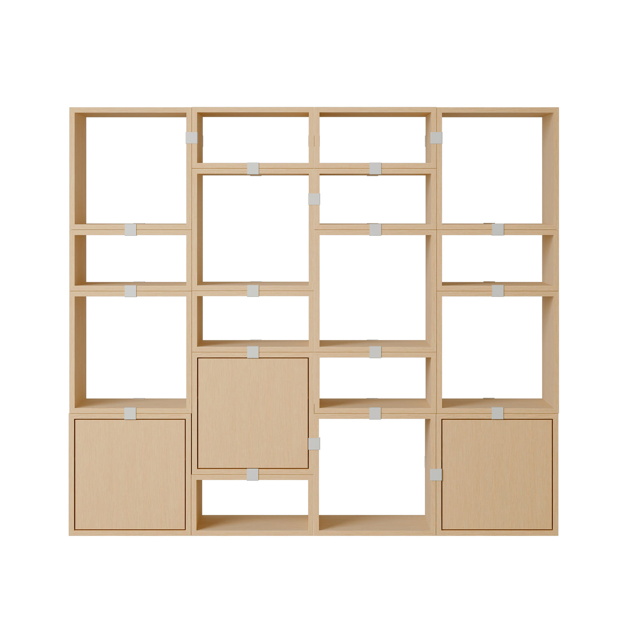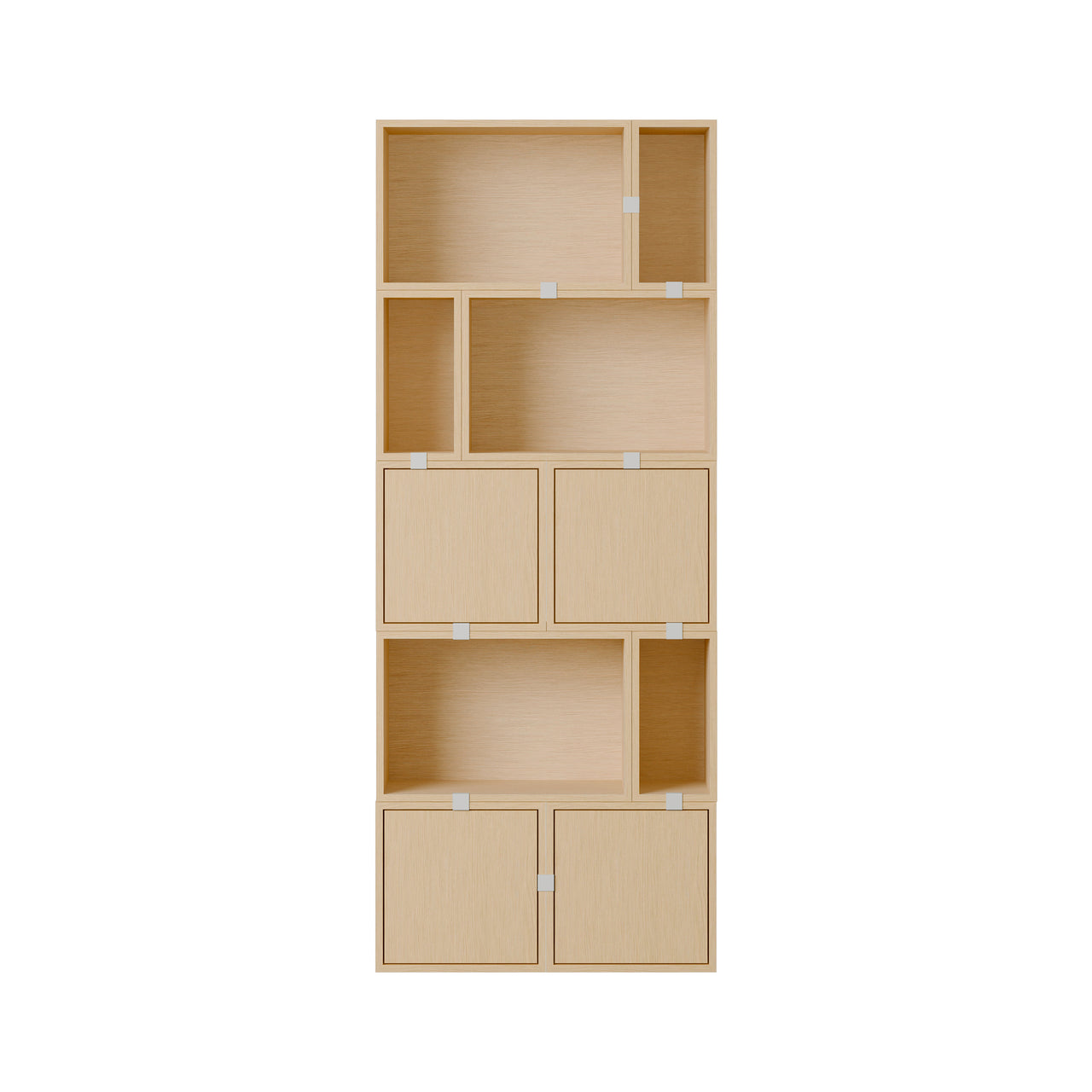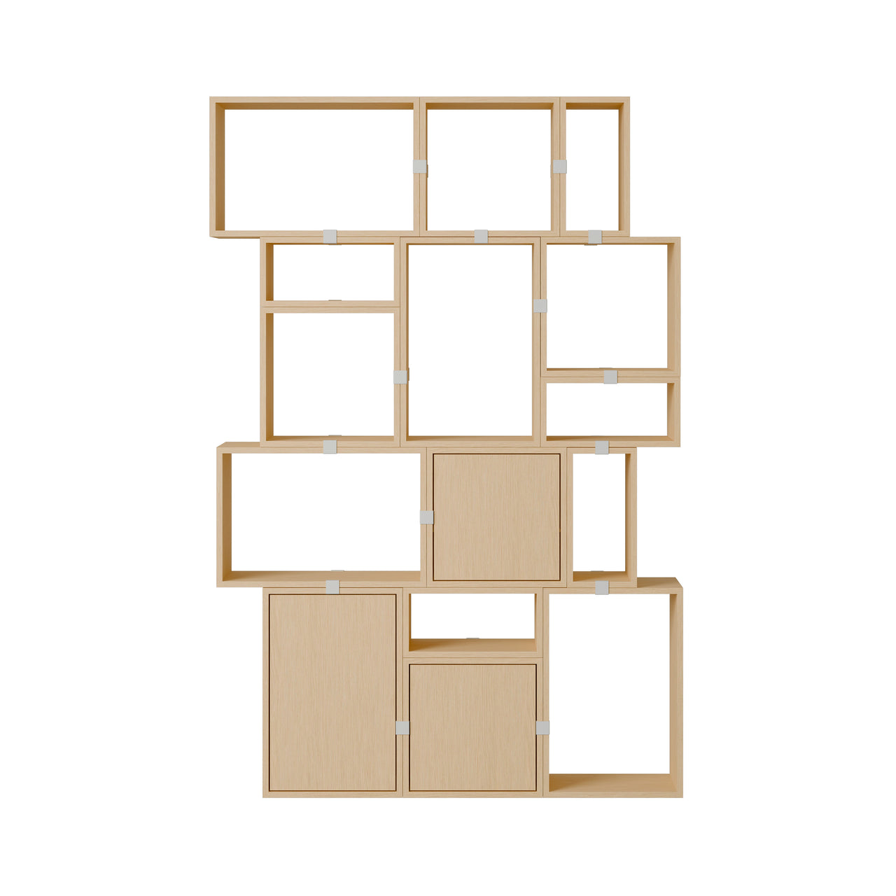 Designed to evolve with changing needs, the Muuto Stacked Storage System Bookcase offers a modular solution adaptable to a variety of spaces. Its components—crafted from PU-lacquered MDF or oak-veneered fiberboard—connect using powder-coated steel clips, allowing for effortless reconfiguration. Modules with backboards can also be wall-mounted, providing installation flexibility.